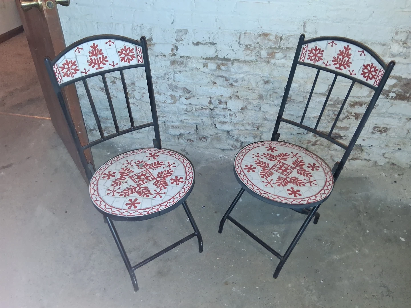 Selling a set of two folding chairs with unique red and white mosaic tile designs. These chairs are perfect for adding a touch of charm to any space! They are in good condition and ready for a new home. One has a chip missing but they are still very charming to look at