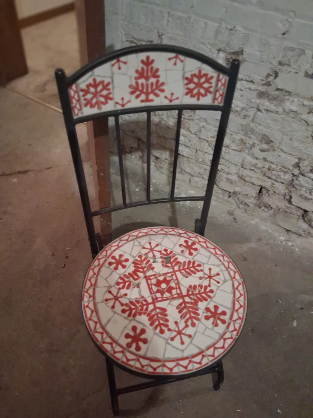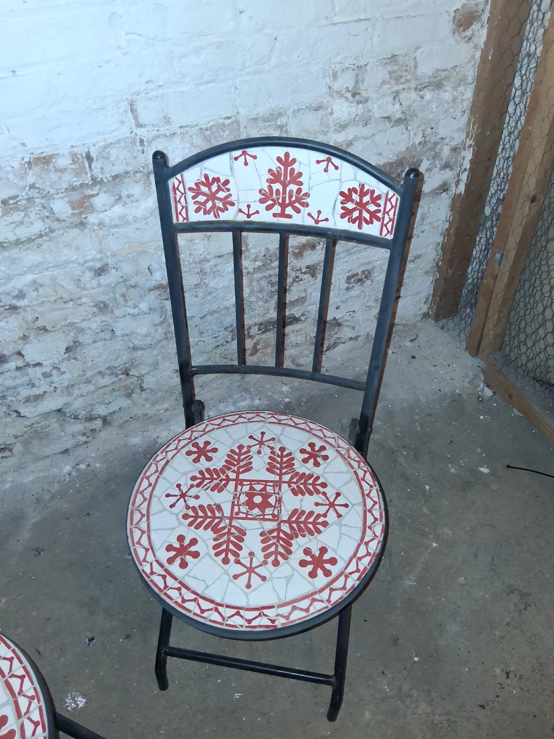 Selling a set of two folding chairs with unique red and white mosaic tile designs. These chairs are perfect for adding a touch of charm to any space! They are in good condition and ready for a new home. One has a chip missing but they are still very charming to look at