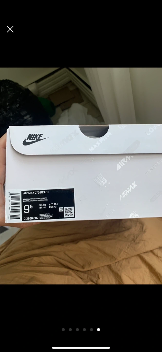Nike Air Max 270 React sneakers in black, white, red, and grey. Men's size 9.5. Includes original box. These shoes offer a comfortable and stylish fit.