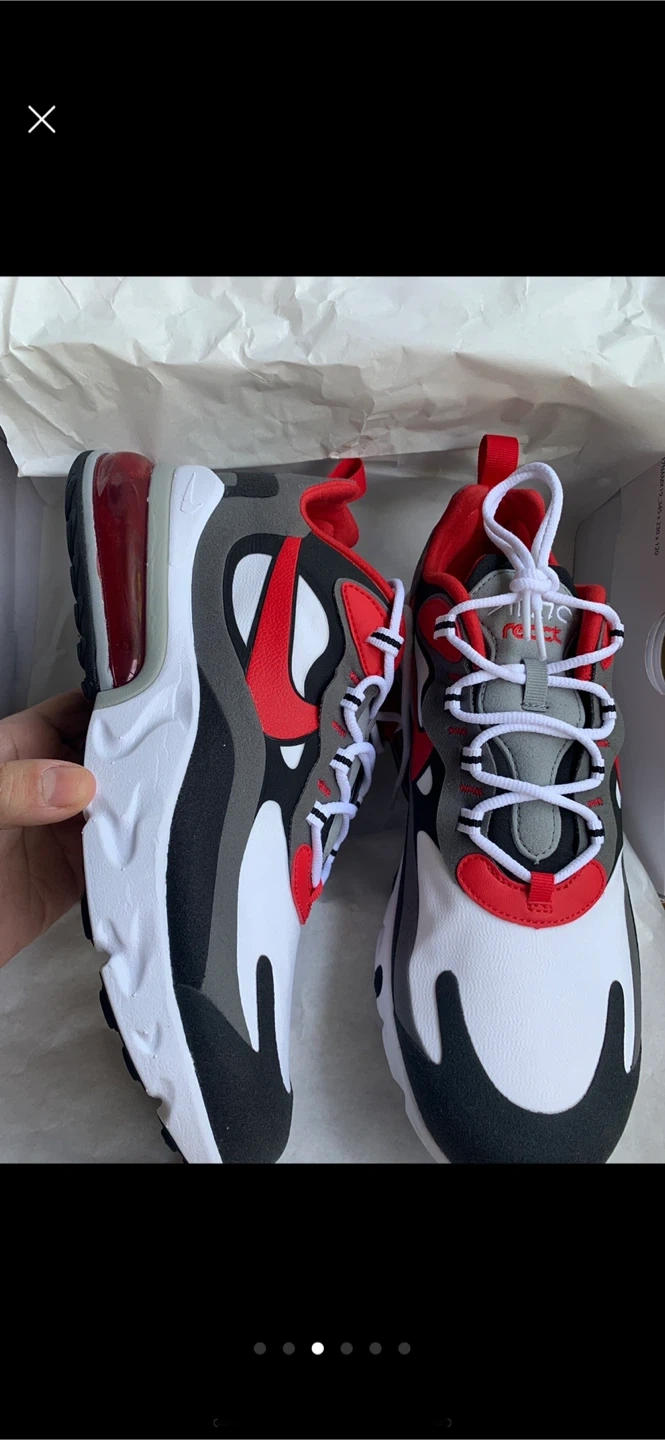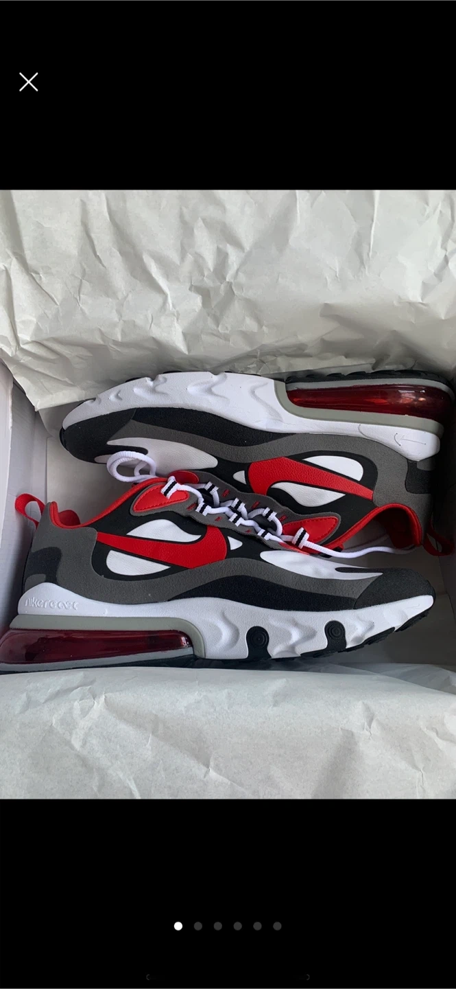 Nike Air Max 270 React sneakers in black, white, red, and grey. Men's size 9.5. Includes original box. These shoes offer a comfortable and stylish fit.