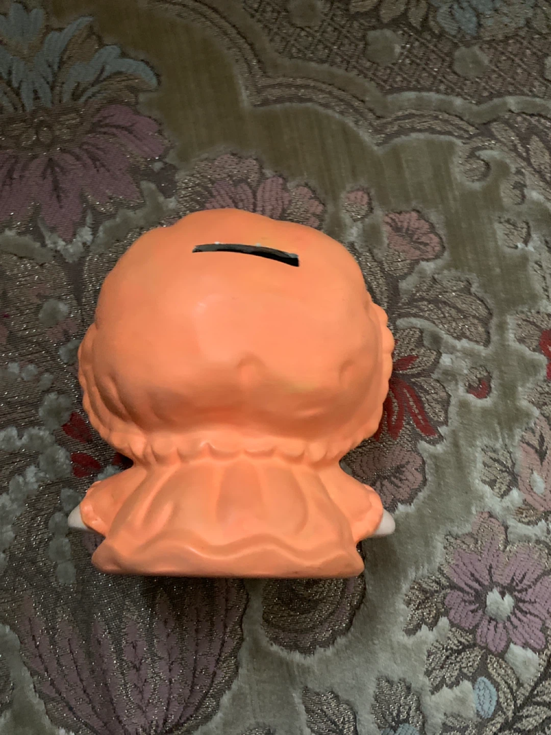 Ceramic coin bank shaped like a cute doll. It's orange with pink cheeks and a red bow. Coin slot is on top.