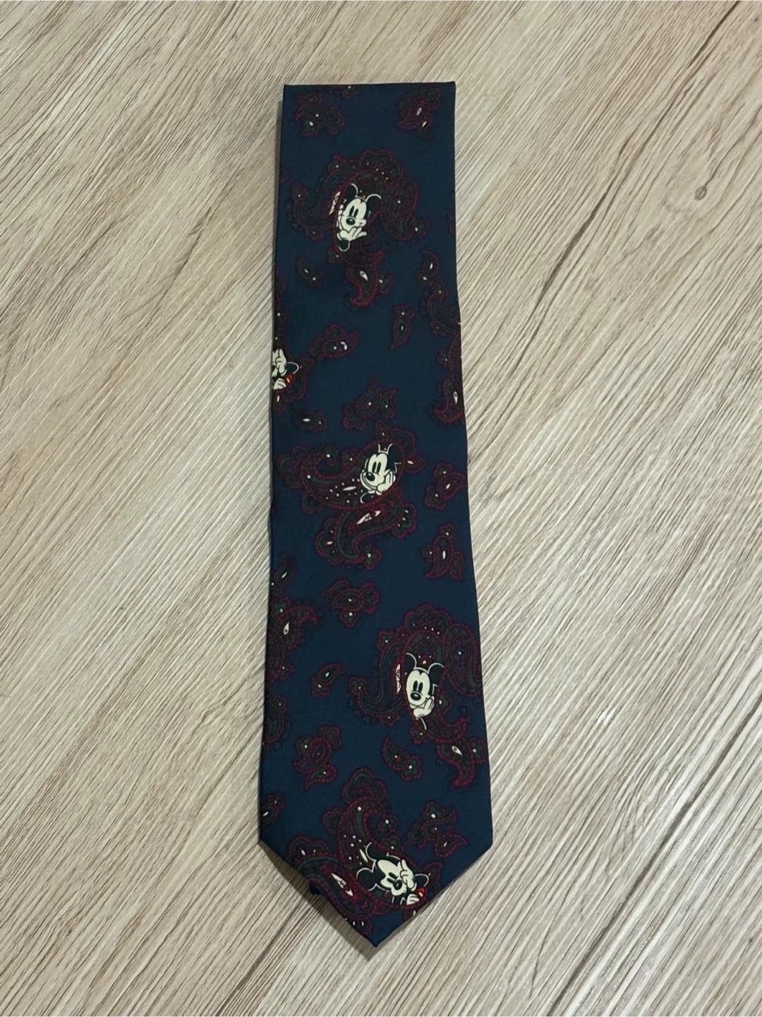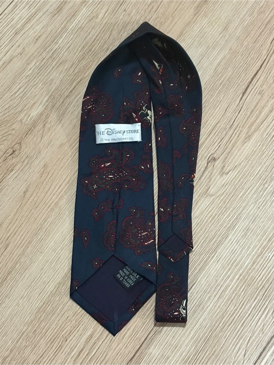 A 100% silk tie from The Disney Store, hand-made in Korea. It features a classic paisley pattern with subtle Mickey Mouse illustrations throughout. This tie would be great for a fan attending a special event!