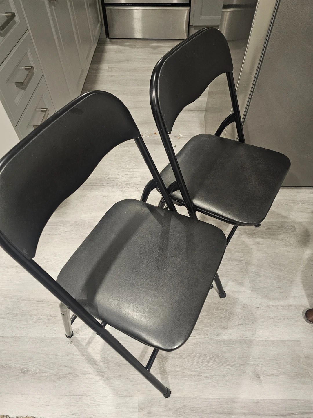 A set of two black folding chairs with metal frames. Durable plastic seats and backs. These chairs are great for extra seating when needed!
