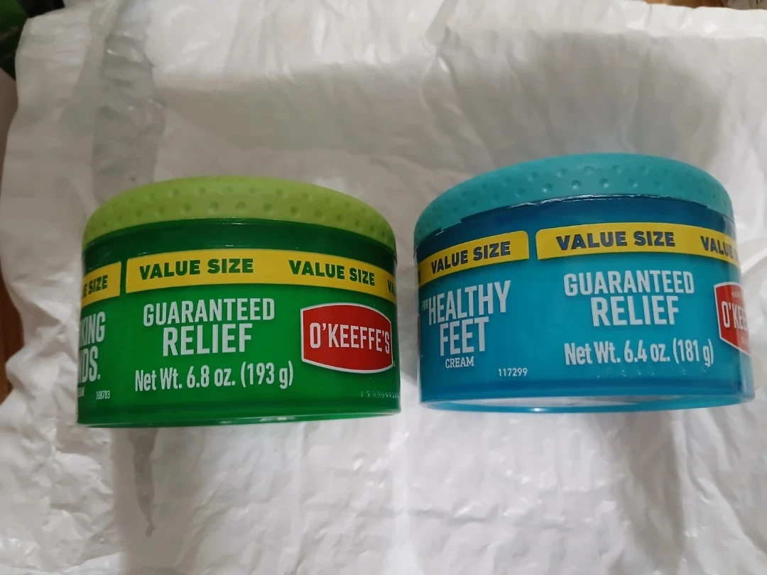 Two O'Keeffe's skincare creams. Includes O'Keeffe's Working Hands cream, net wt. 6.8 oz (193 g). Also includes O'Keeffe's Healthy Feet cream, net wt. 6.4 oz (181 g). Both offer guaranteed relief.