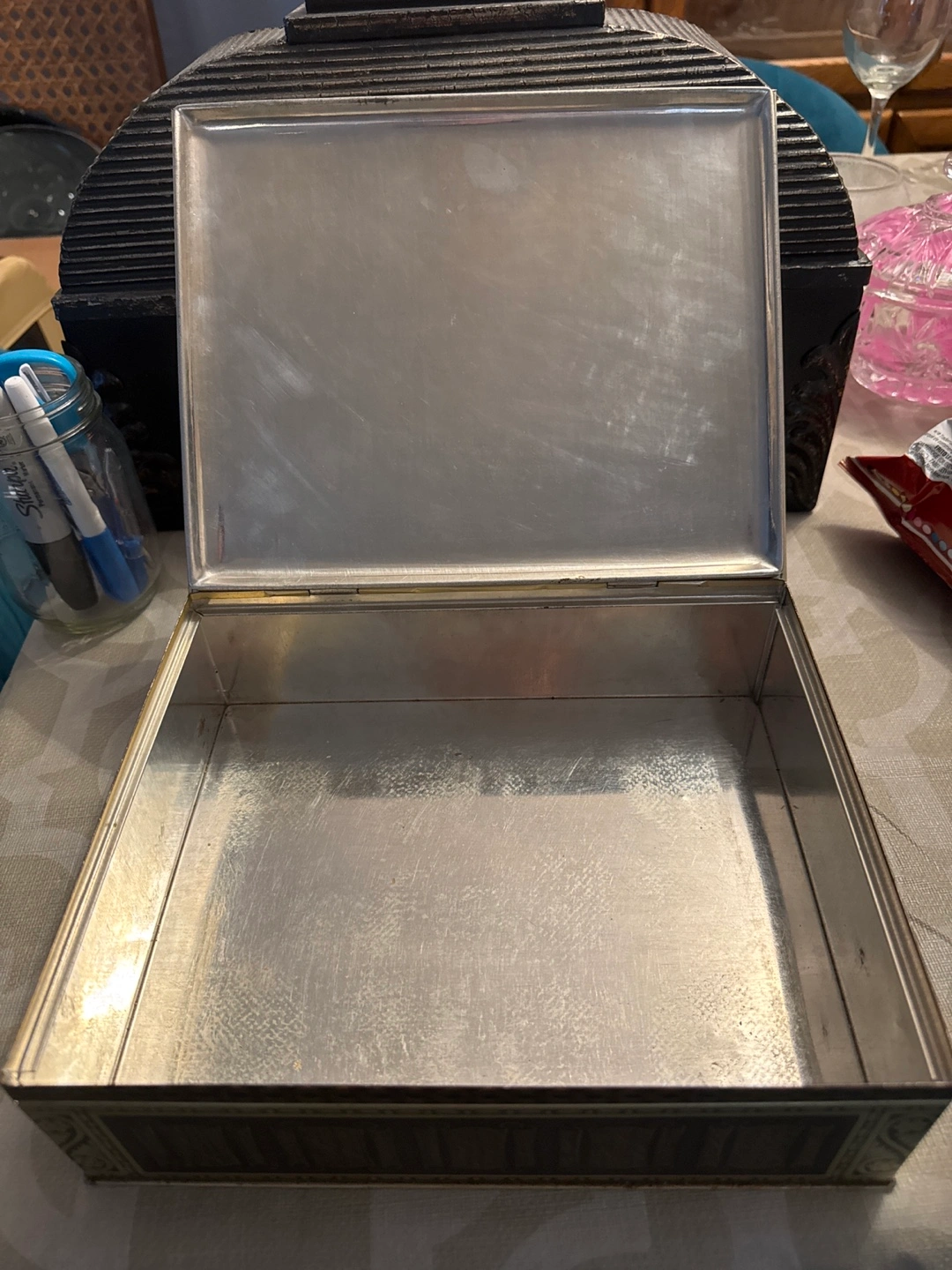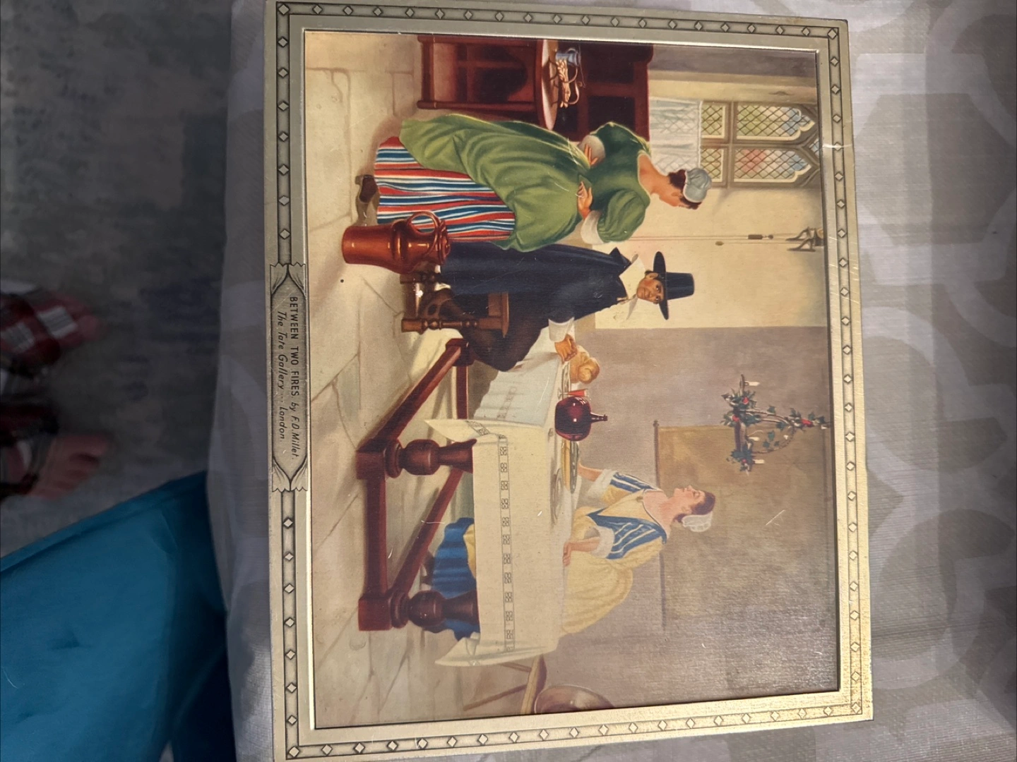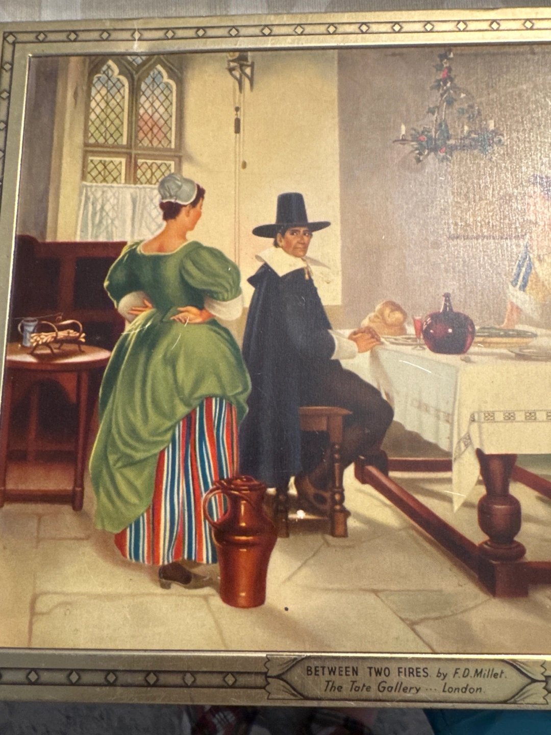 Selling a vintage decorative tin box featuring the painting "Between Two Fires" by F.D. Millet from The Tate Gallery, London. It's a lovely piece for storage or display!