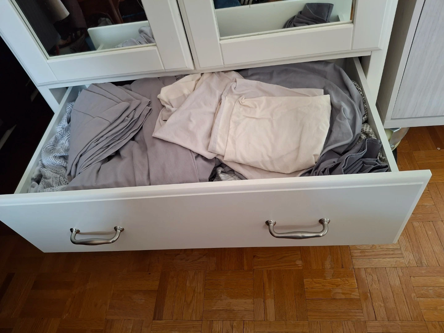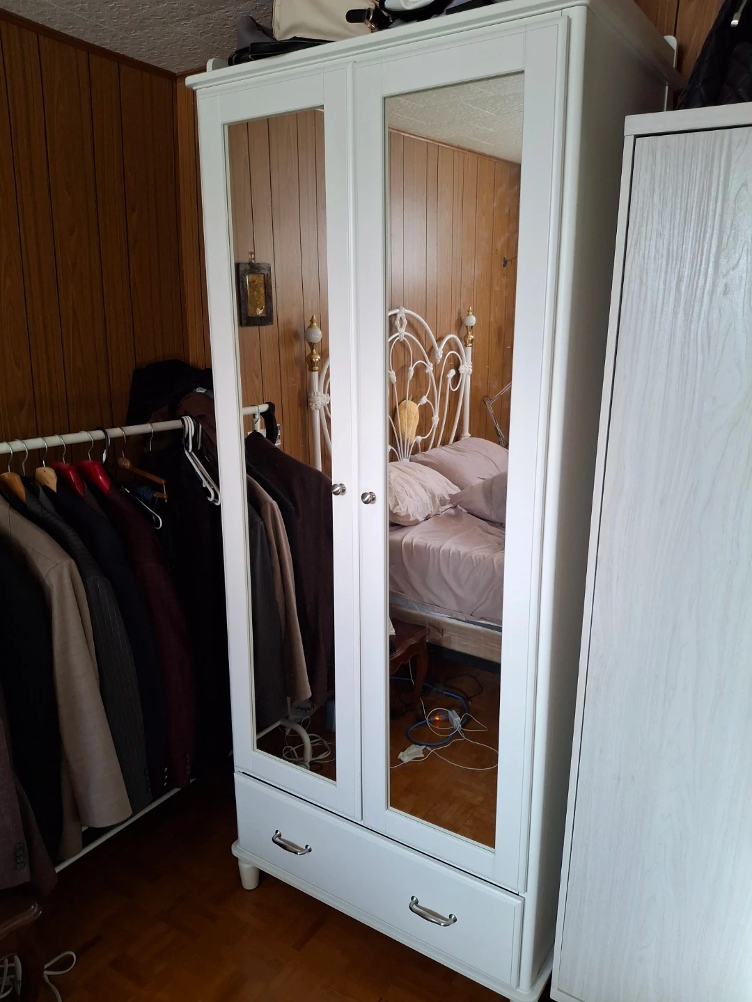 Selling a wardrobe with mirrored doors. It has a drawer at the bottom and shelving and a hanging rod inside. Extremely sturdy, and comes without the stuff inside! Great for adding storage to a bedroom or closet!