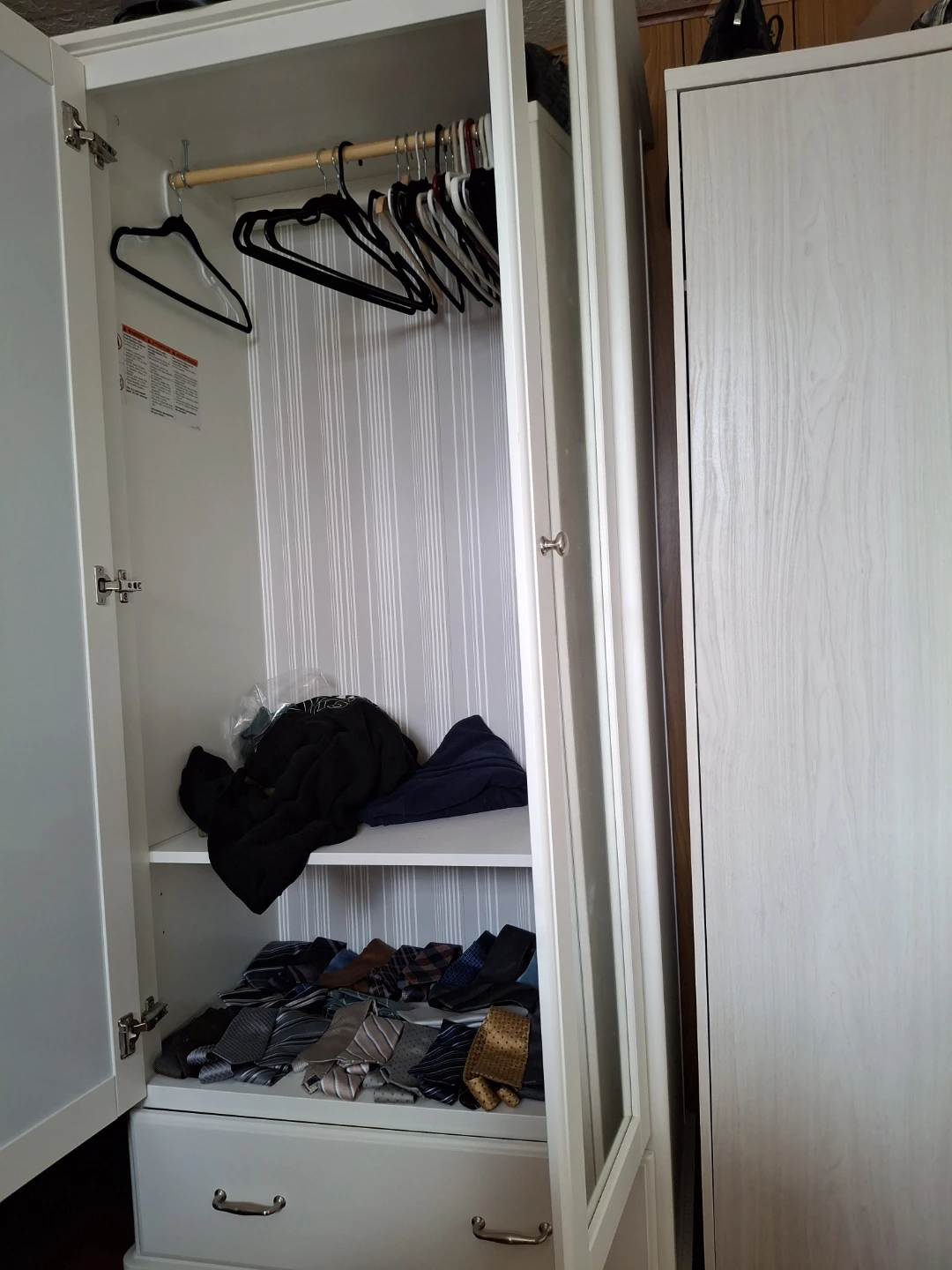 Selling a wardrobe with mirrored doors. It has a drawer at the bottom and shelving and a hanging rod inside. Extremely sturdy, and comes without the stuff inside! Great for adding storage to a bedroom or closet!
