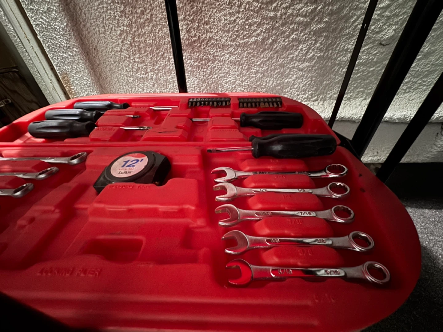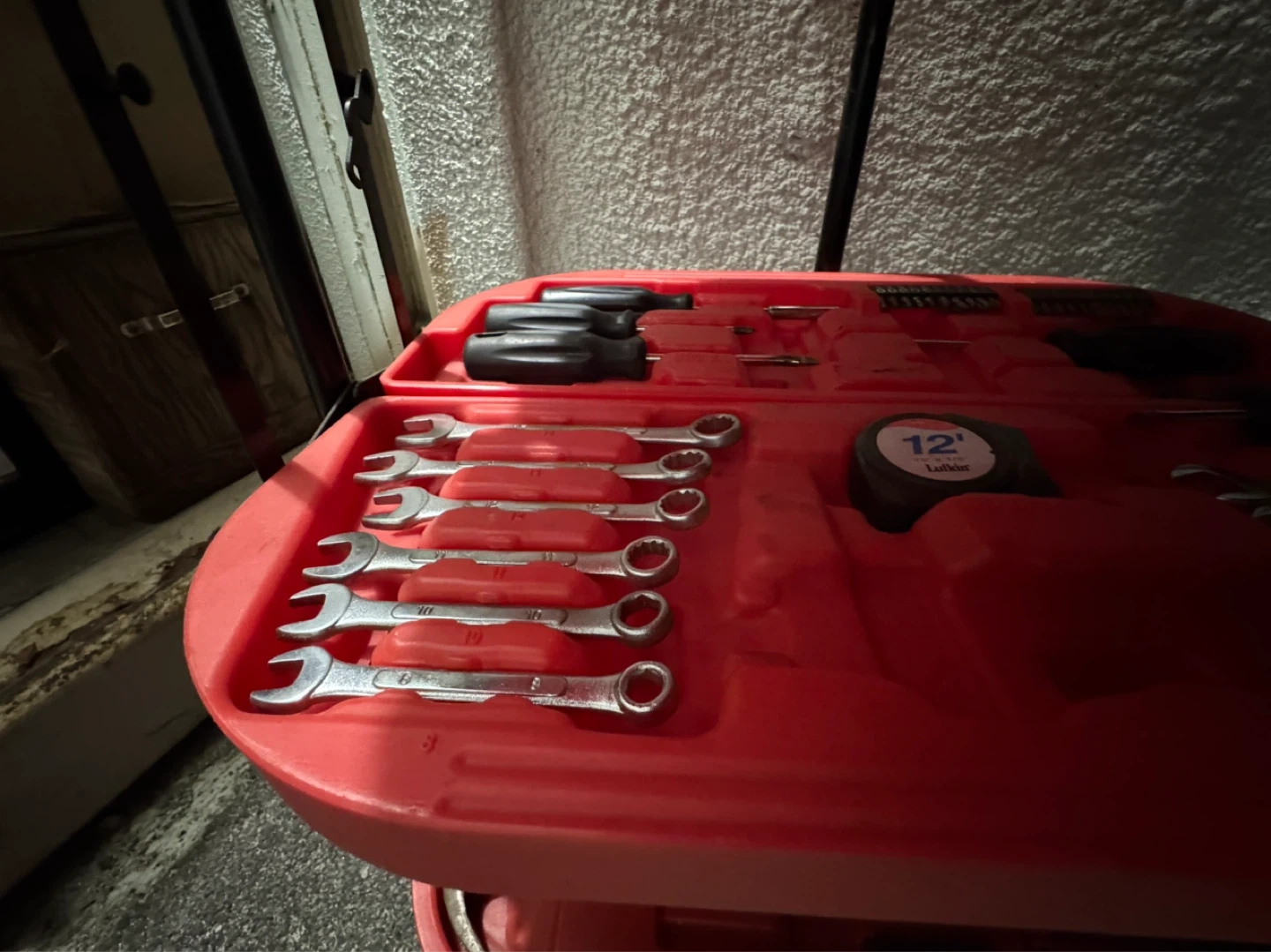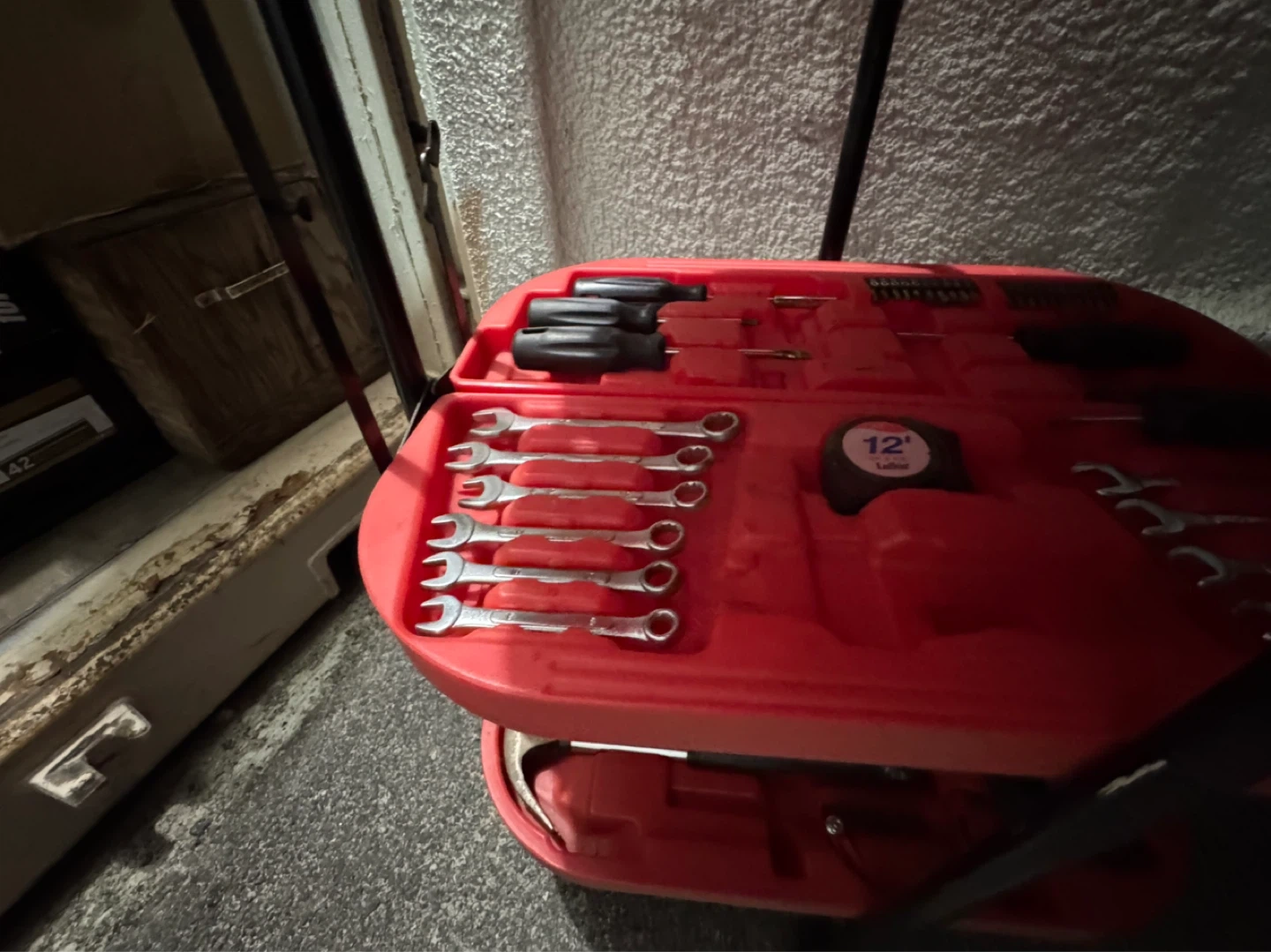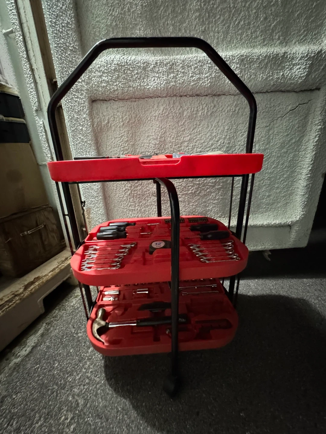 This is a red tool cart with three tiers, filled with various wrenches, pliers, screwdrivers, and hex keys. It also includes a hammer and a utility knife. It's a comprehensive set for general repairs and DIY projects. Located in Oliver