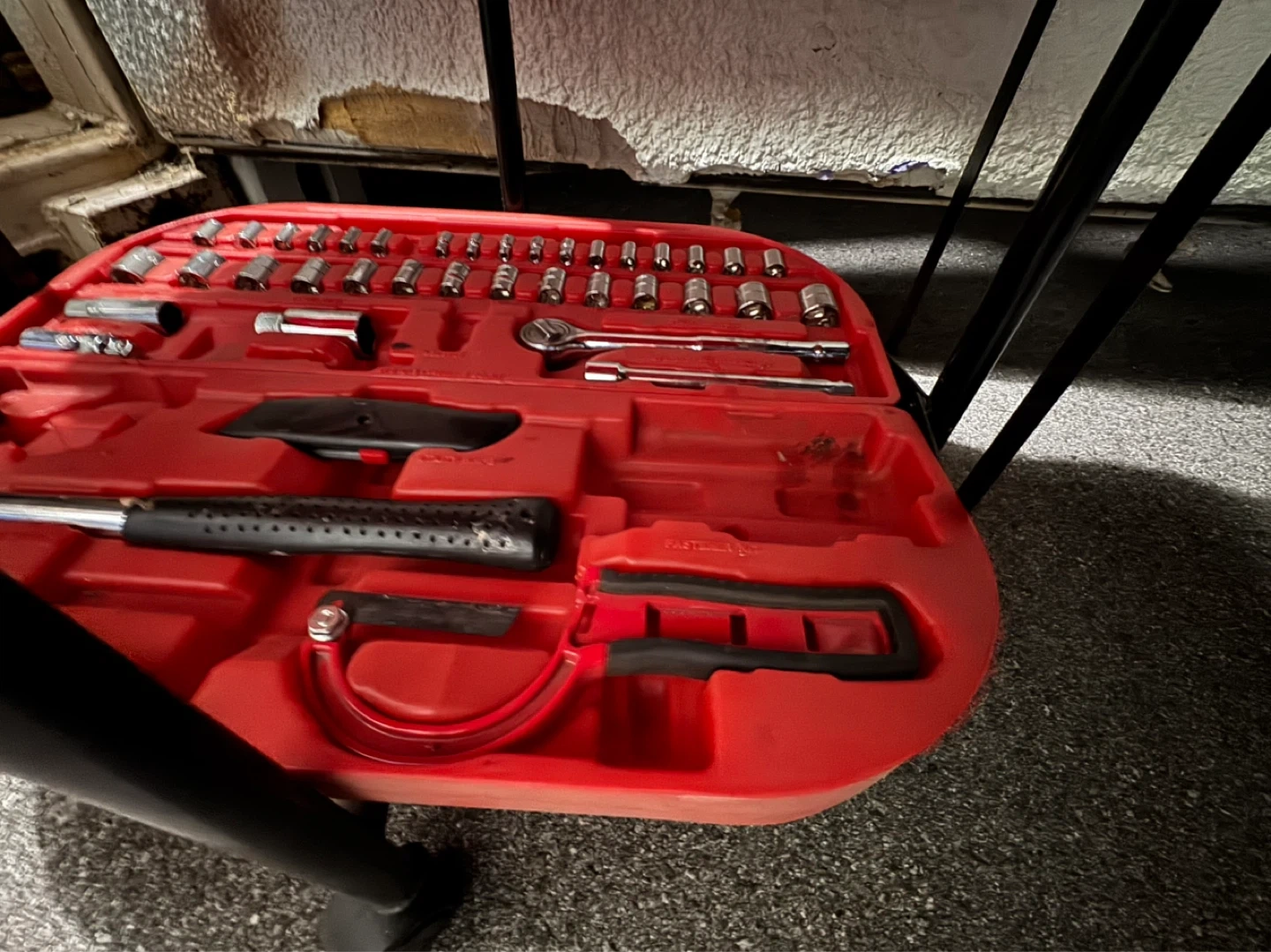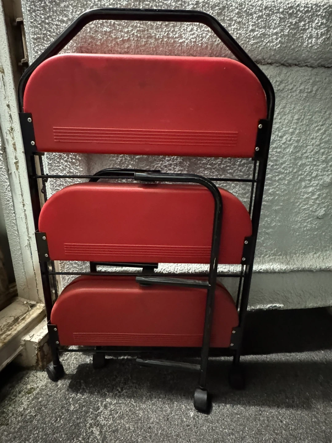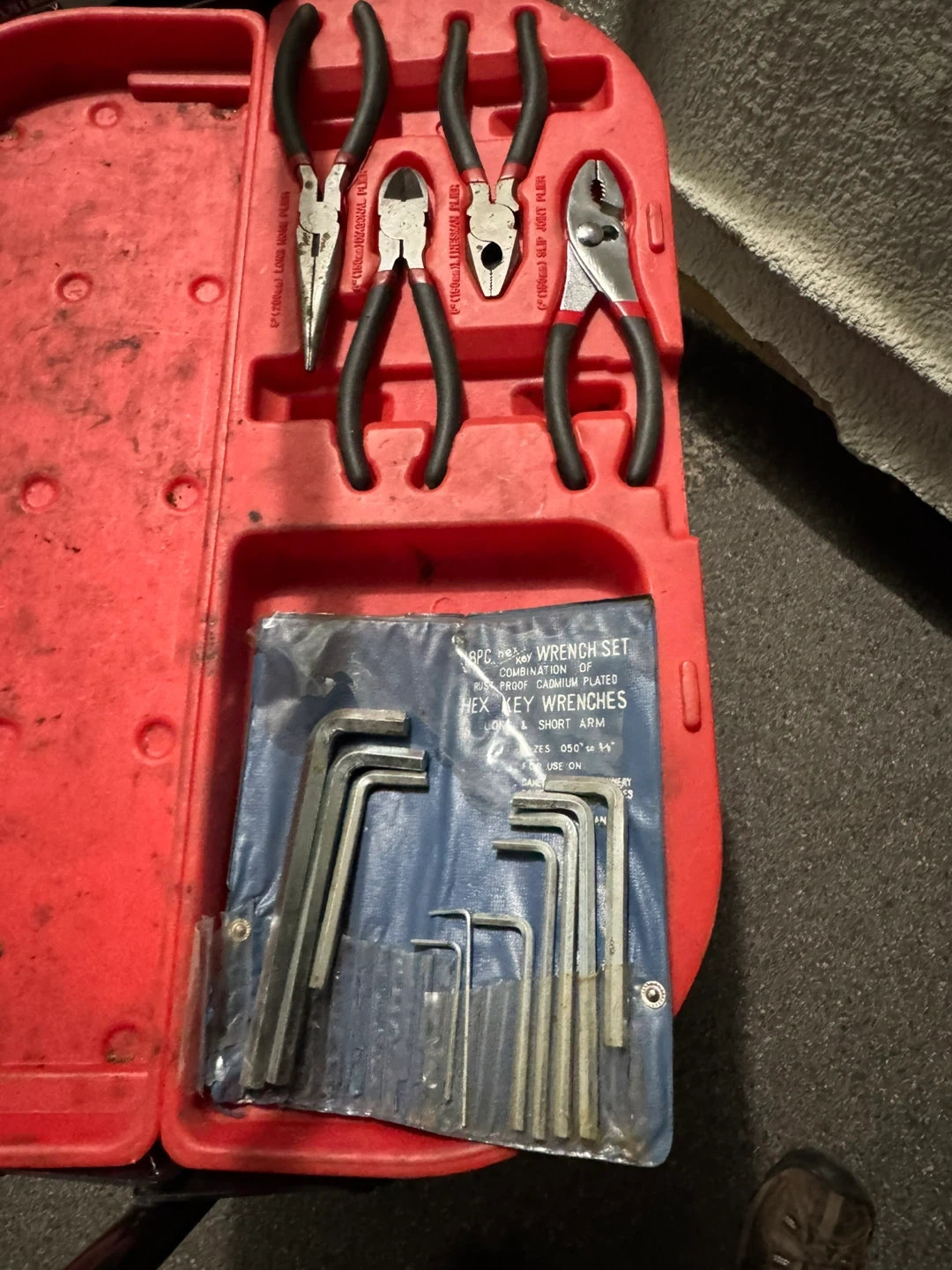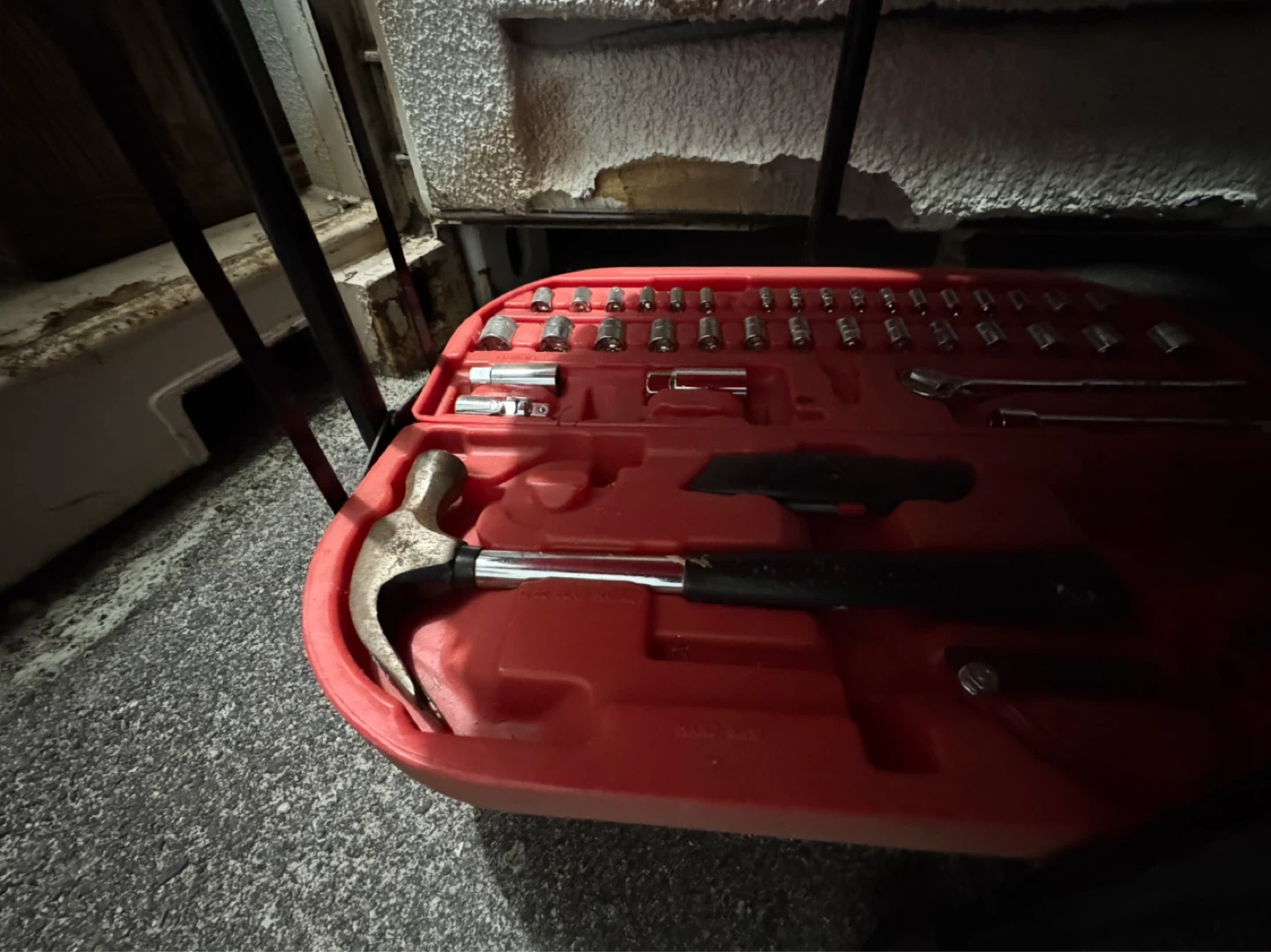 This is a red tool cart with three tiers, filled with various wrenches, pliers, screwdrivers, and hex keys. It also includes a hammer and a utility knife. It's a comprehensive set for general repairs and DIY projects. Located in Oliver