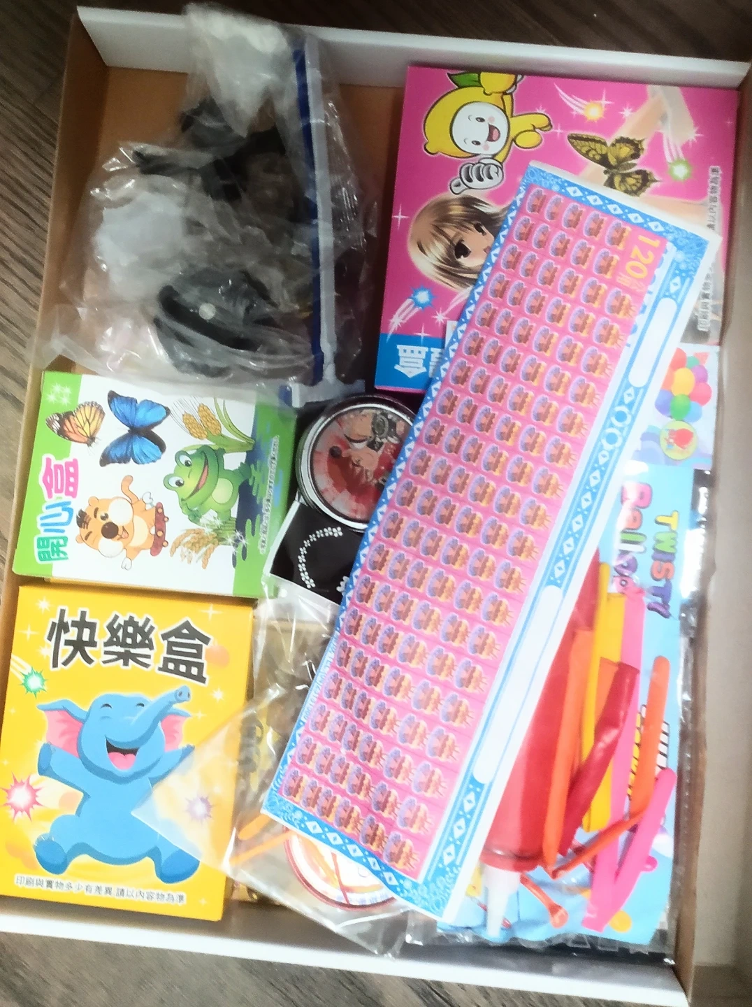 Large box filled with various small toys and party supplies. Includes small plastic toys, stickers, and other items. Perfect for a child's birthday party or piñata. Contents largely unknown, image shows some examples.
