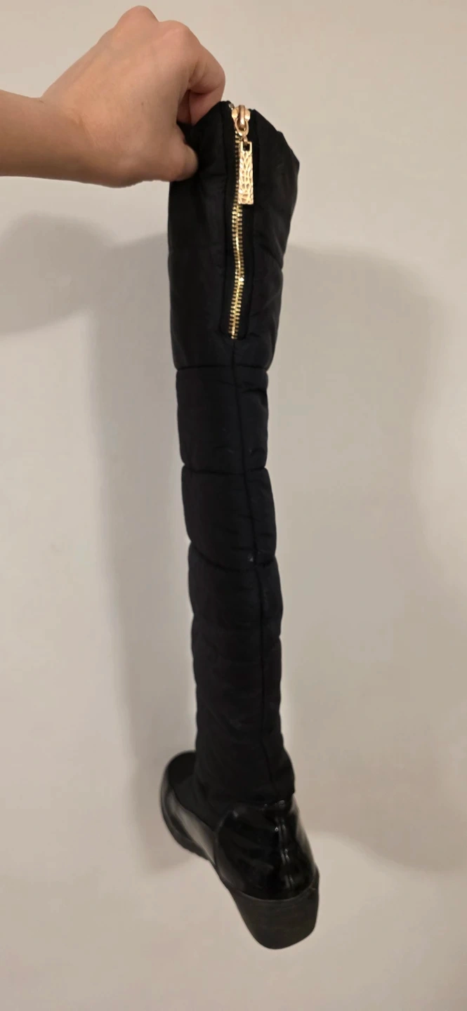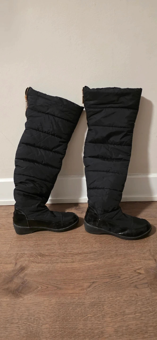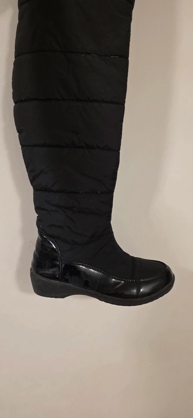 Winter boots/ Black Puffer Knee-High Boots with Patent Toe