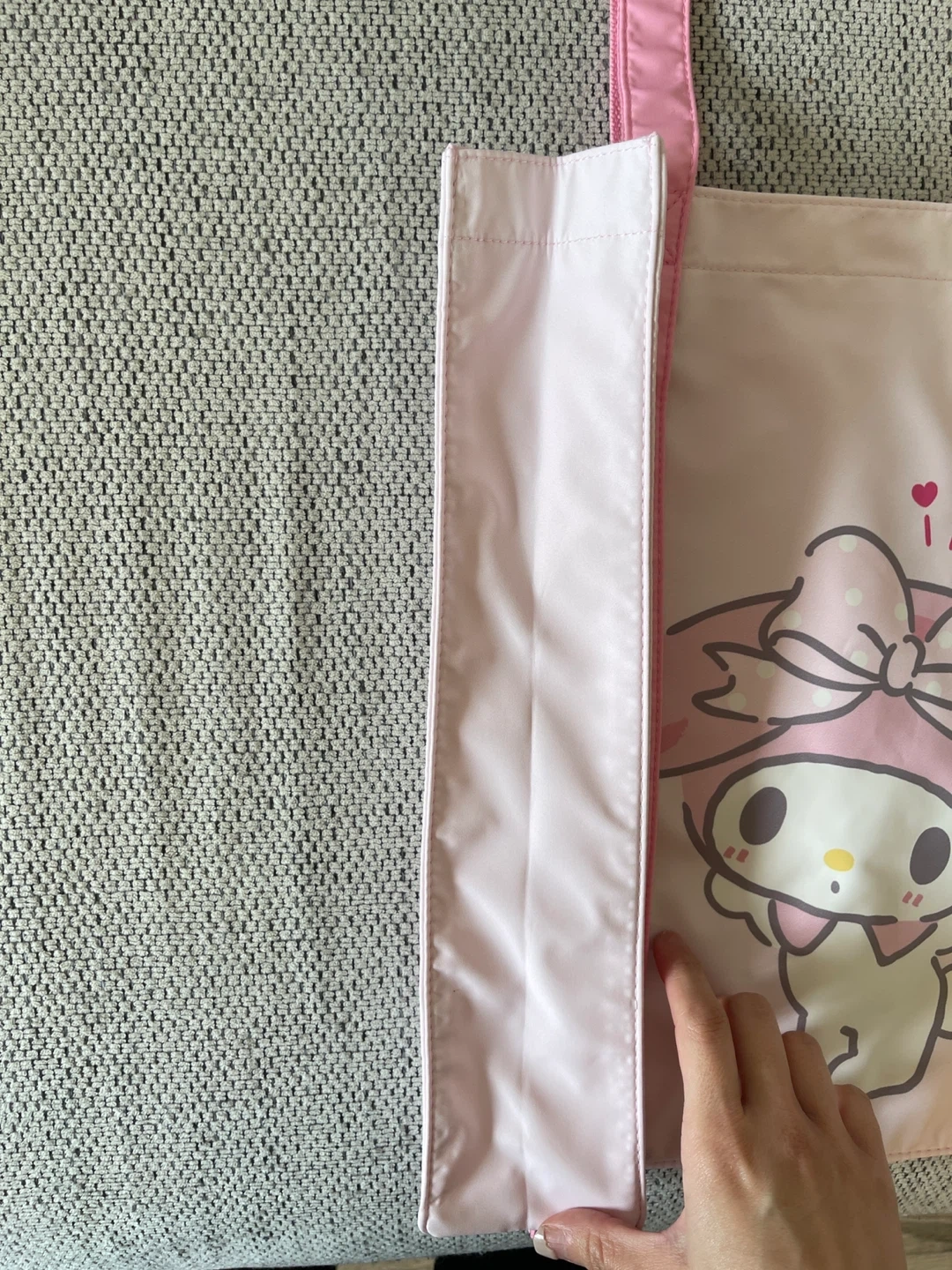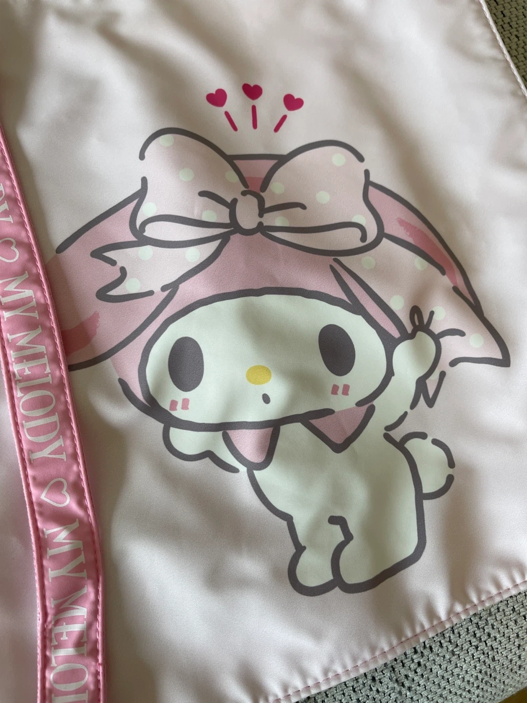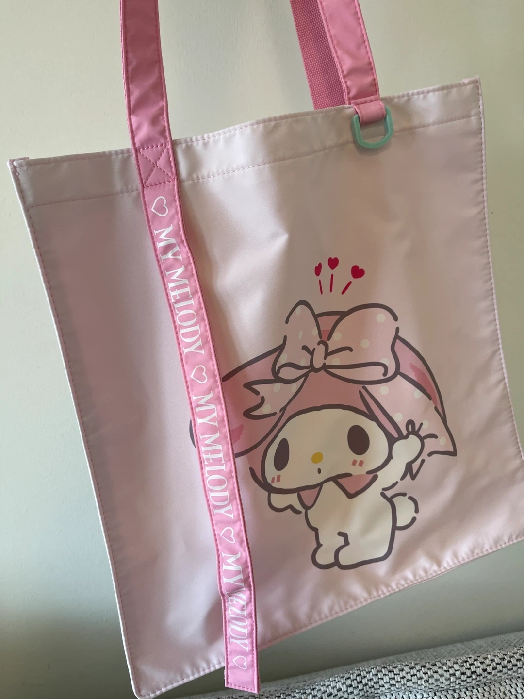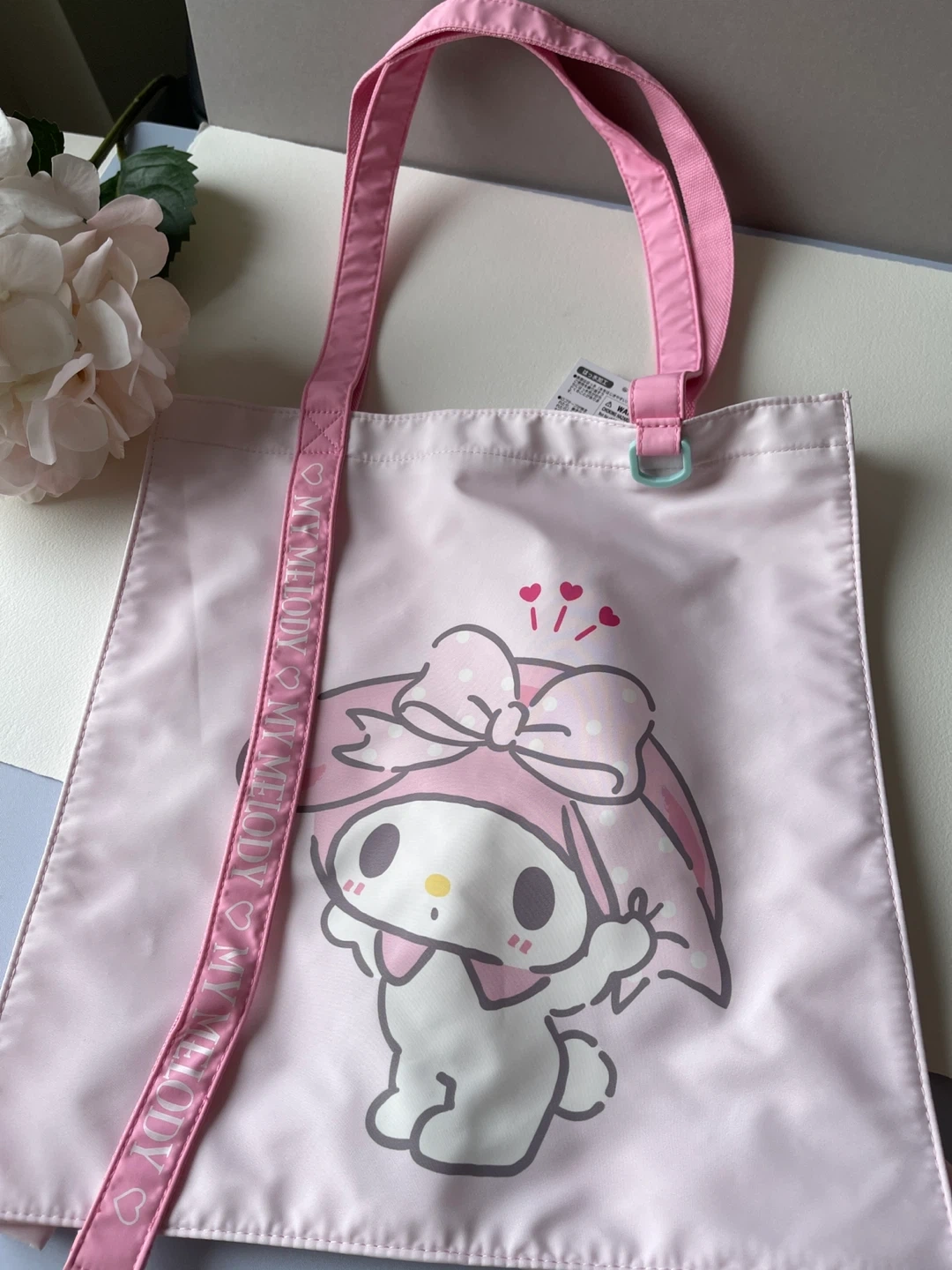 This is a cute pink tote bag featuring My Melody. It's made of polyester and has adjustable shoulder straps. Perfect for everyday use!