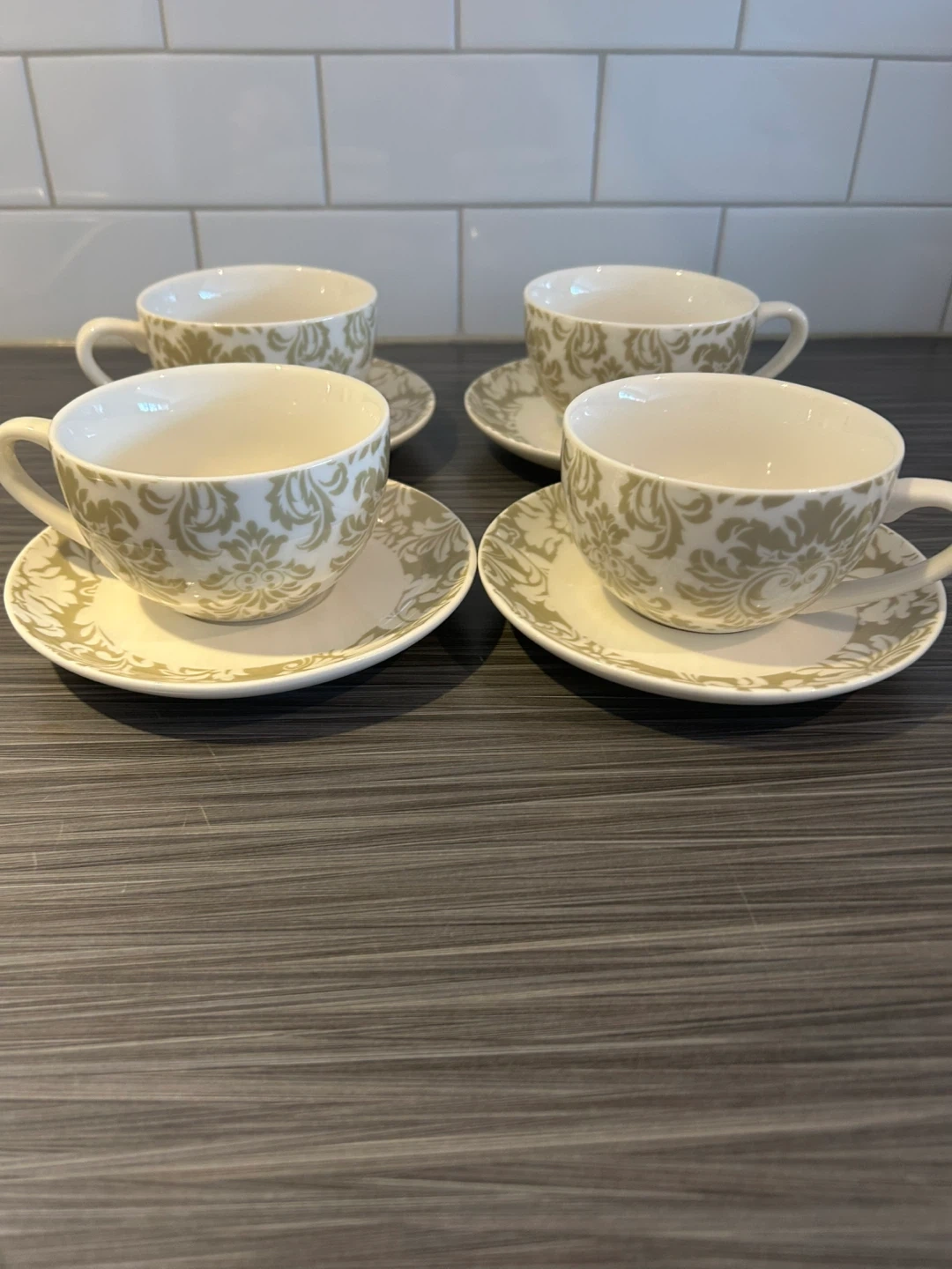 Set of 4 Bowring cups and saucers. White porcelain with a green damask pattern. Dishwasher and microwave safe. Used just a couple of times.