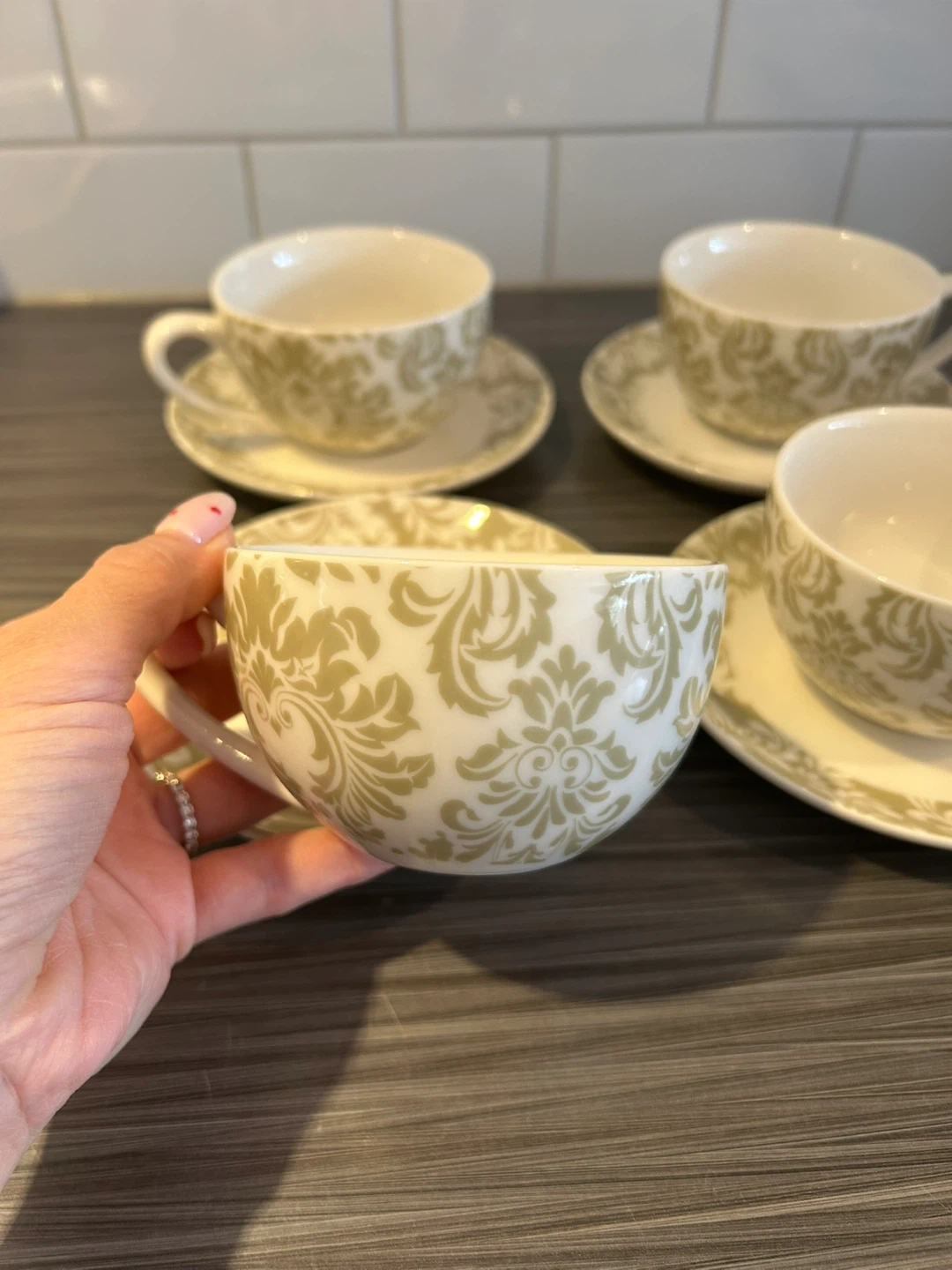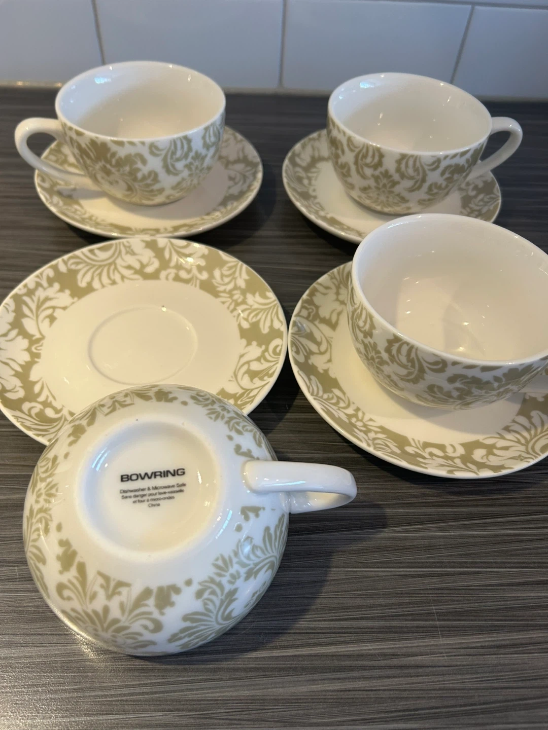 Set of 4 Bowring cups and saucers. White porcelain with a green damask pattern. Dishwasher and microwave safe. Used just a couple of times.