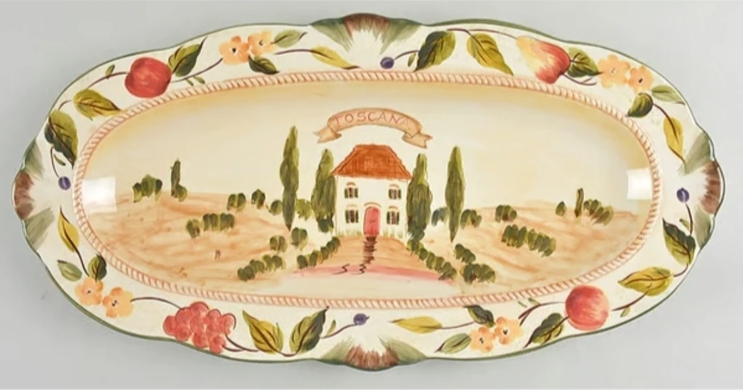 This is a 19-inch fish platter from Toscana. It features a charming Italian countryside scene with a house and fruit border. This platter's decorative design makes it a lovely serving piece for special occasions.