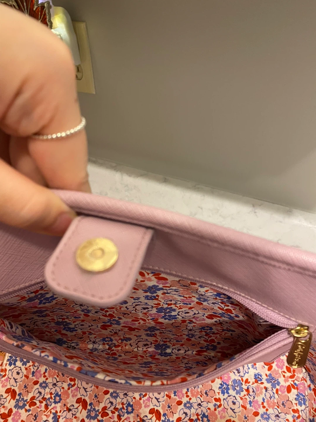 This Cath Kidston tote bag features a lovely pink exterior with a colourful floral lining. It has a zip pocket inside for smaller items. The material is a durable canvas.