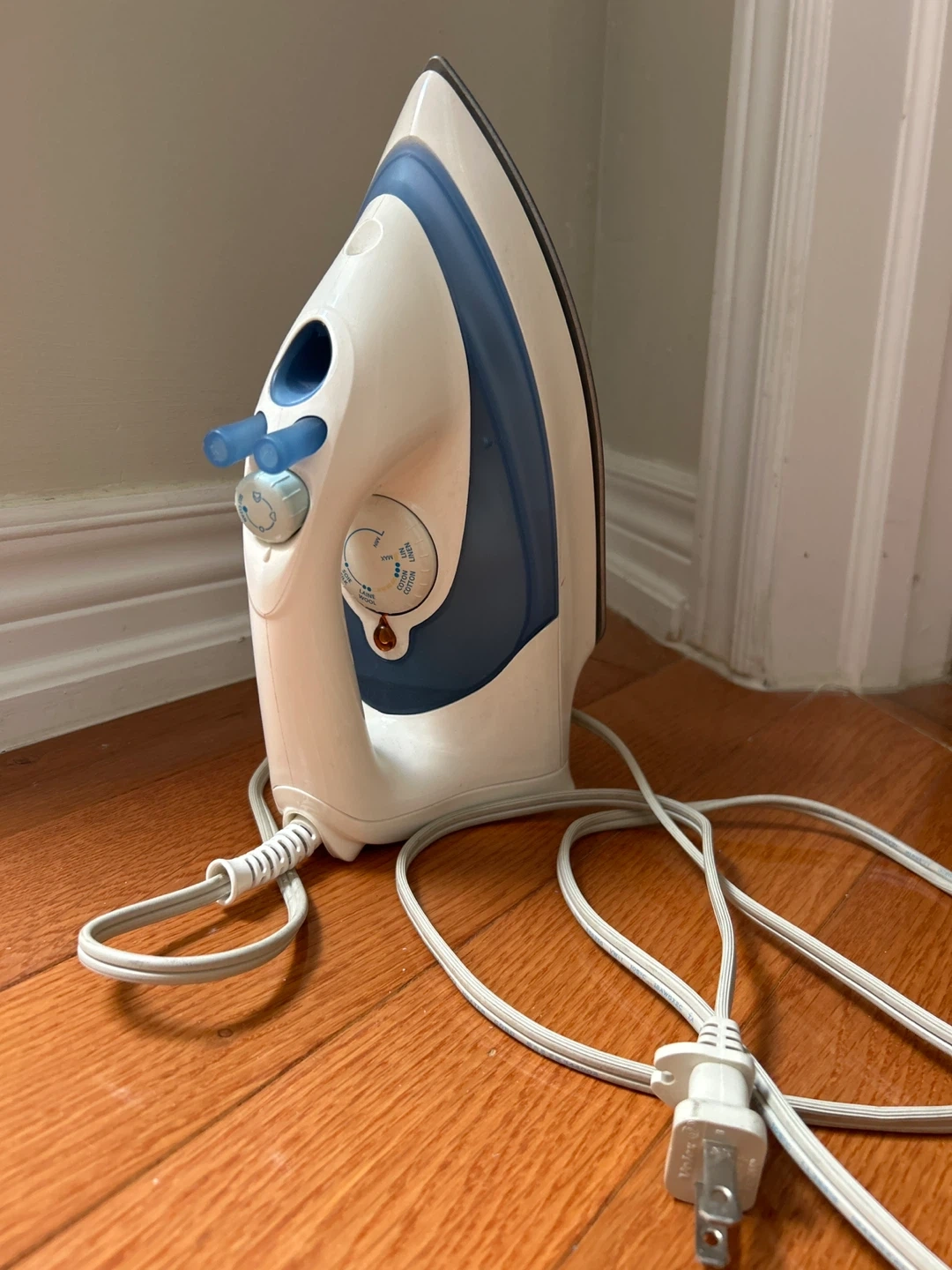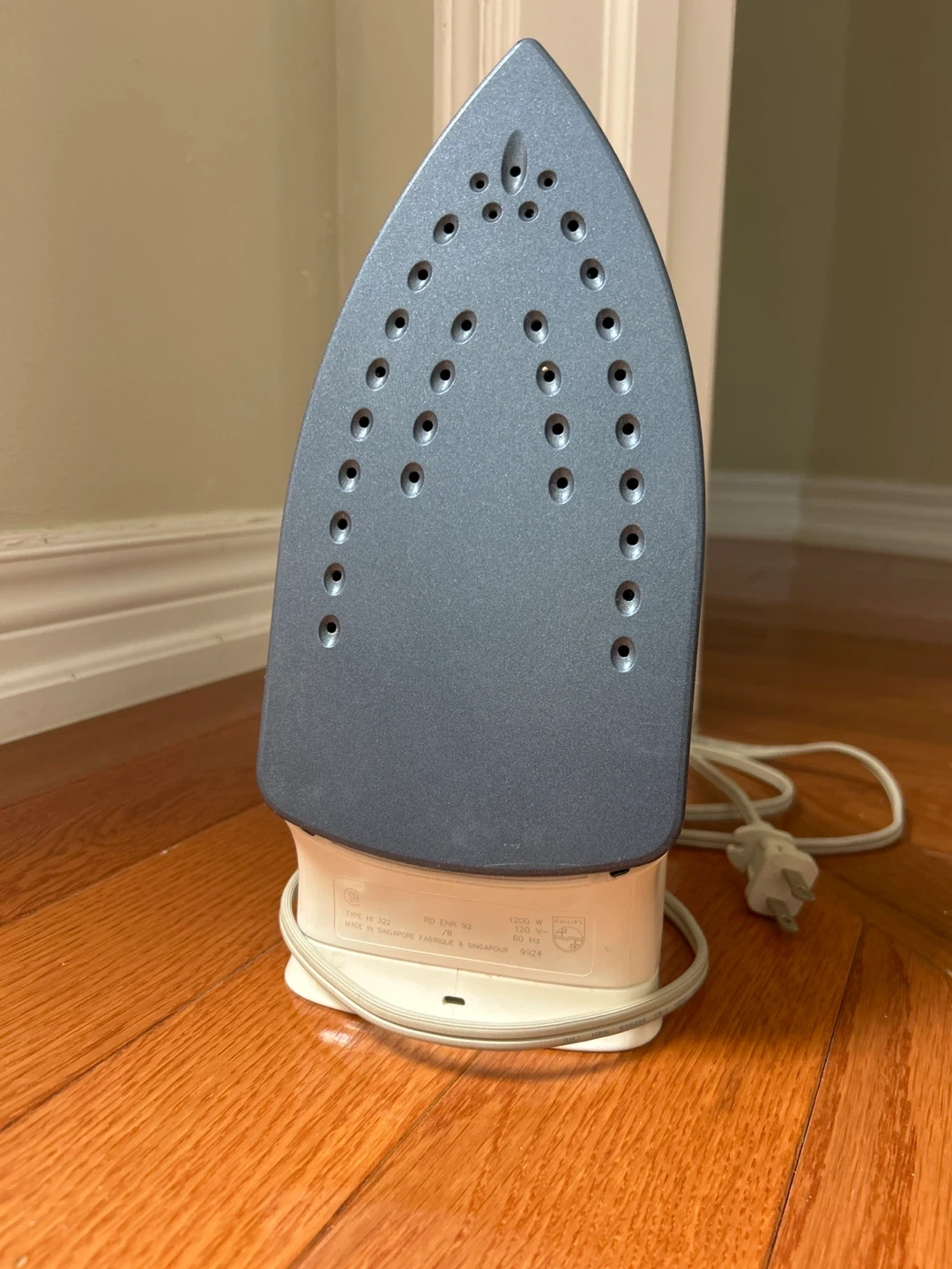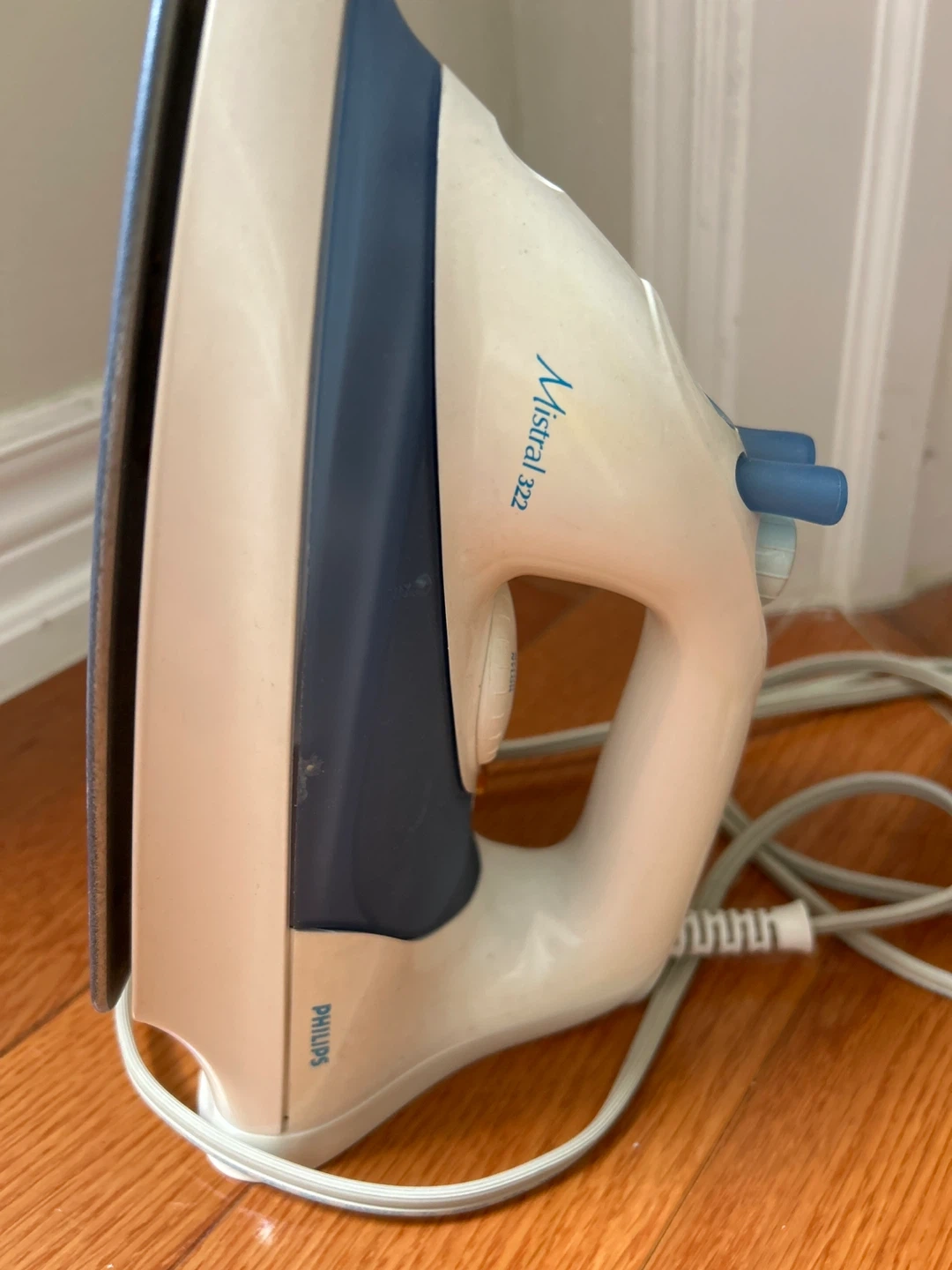 Philips Mistral 322 steam iron. It has adjustable temperature settings, worked well for my job interview shirt but I have not used it since!