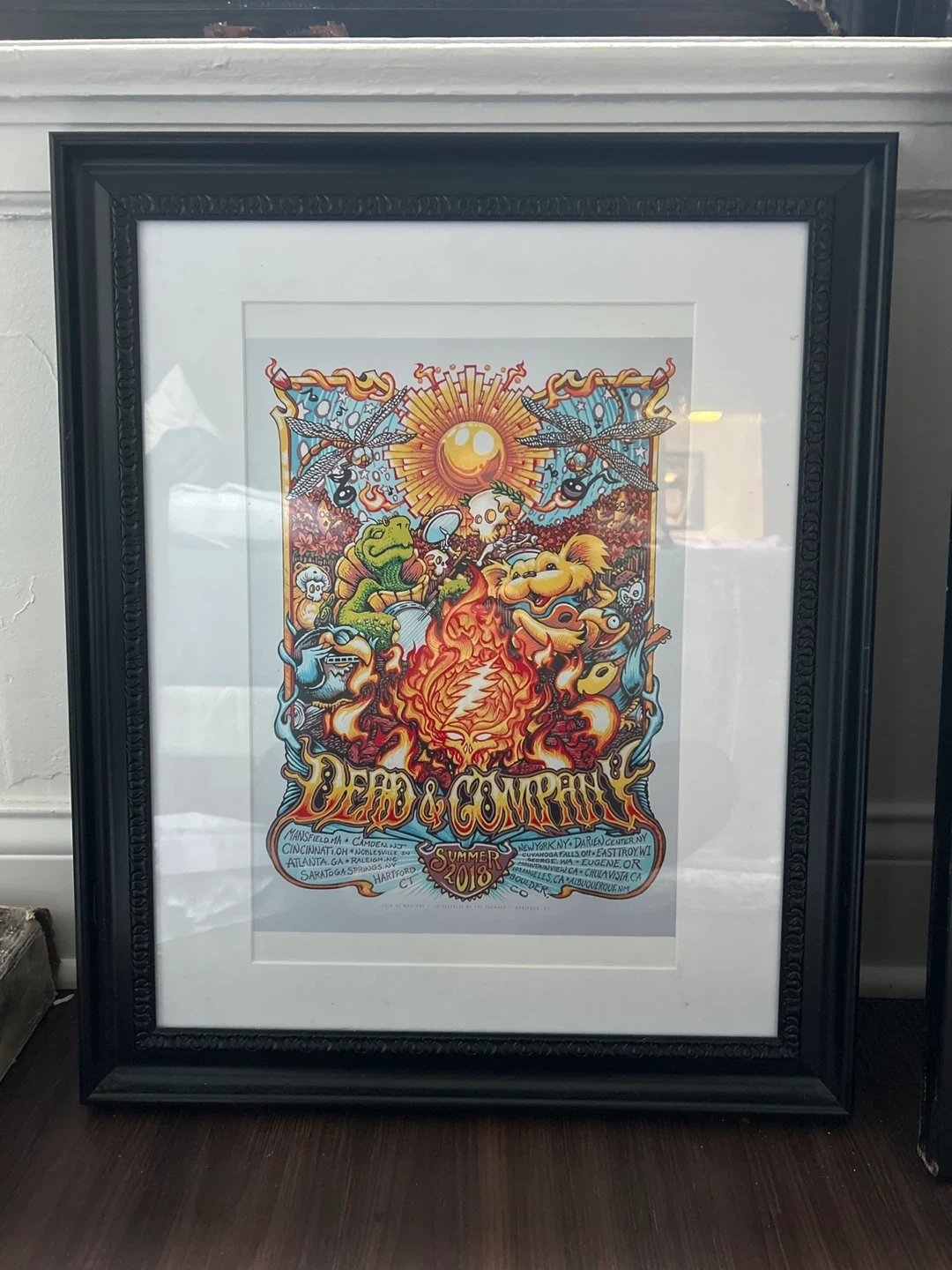 This is a framed poster for the Dead & Company Summer 2018 tour. The poster features vibrant artwork and lists many of the tour dates and locations. It's ready to hang!