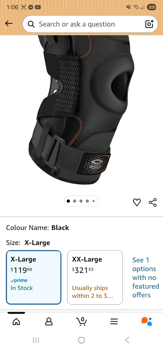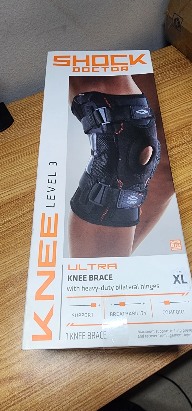 This is a Shock Doctor Ultra Knee Support brace in black, size X-Large. It features bilateral hinges for support and is made of comfortable, high-performance neoprene. It has easy-to-use finger tabs for pulling it on. This brace offers maximum support to help prevent and recover from ligament injuries.