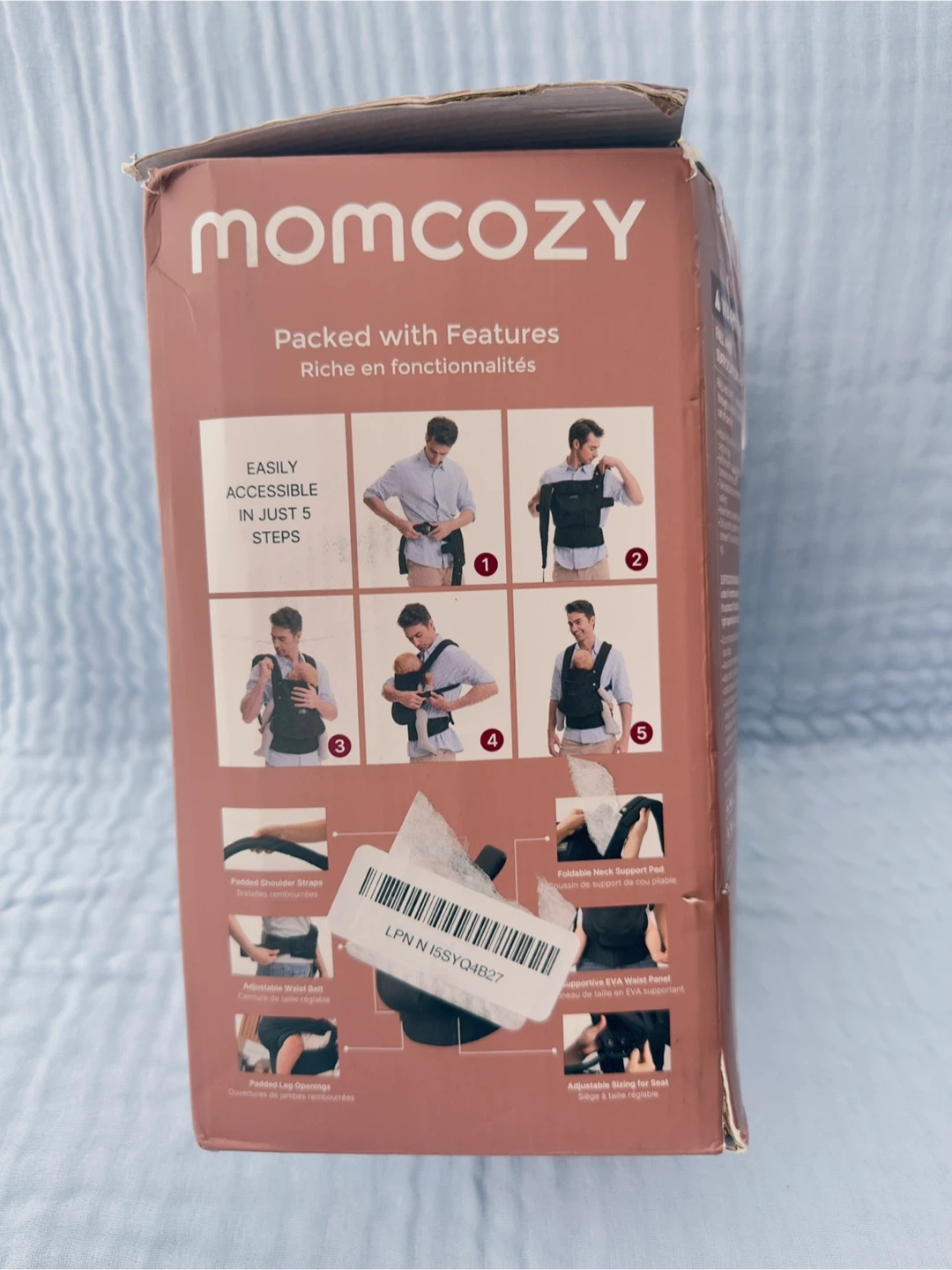 Selling a Momcozy baby carrier in black! It's in great condition and comes with the original box. This carrier is packed with features to make carrying your little one easier and more comfortable. It features padded shoulder straps, an adjustable waist belt, and adjustable leg openings. A great way to keep your baby close and your hands free!