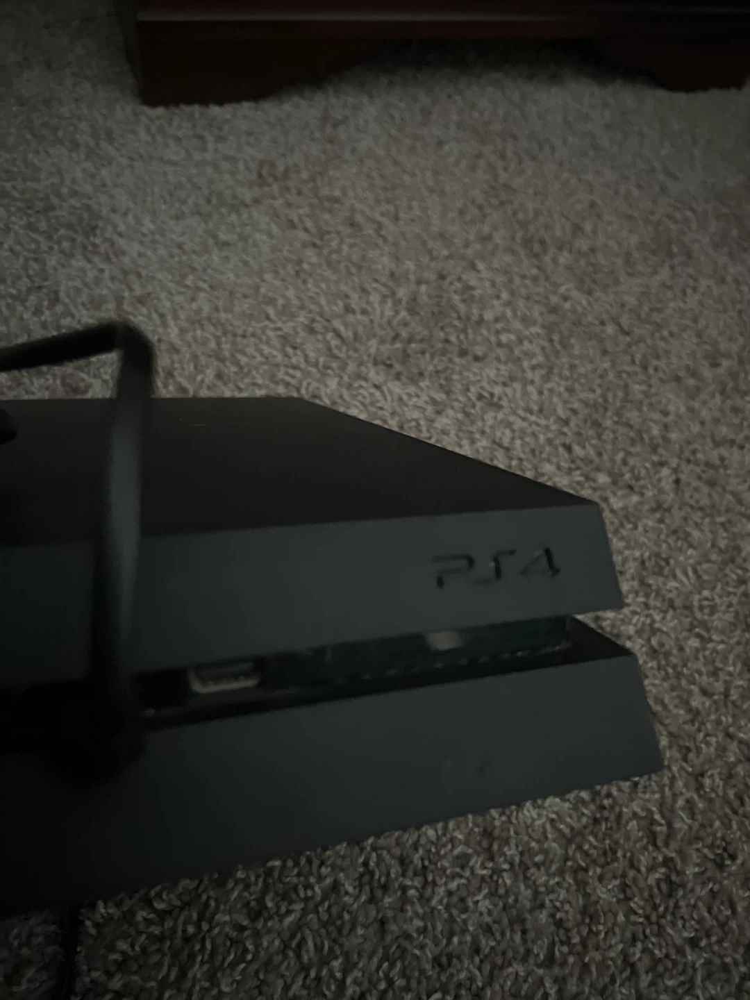 This is a black PlayStation 4 console. It comes with a red wireless controller and necessary cables. Ready for gaming!