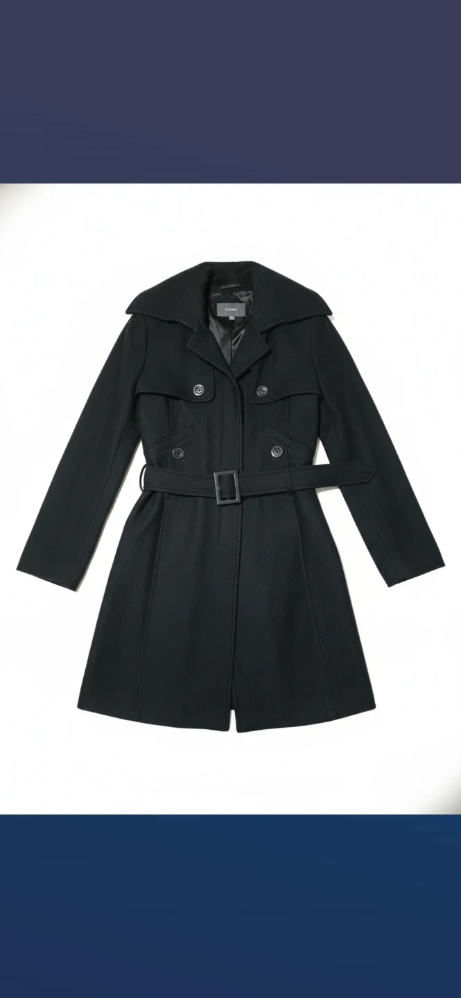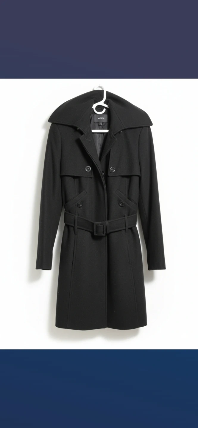 This Mexx trench coat is crafted from a black wool blend. It features a belted waist and a classic collar. A stylish outerwear piece perfect for cooler weather!