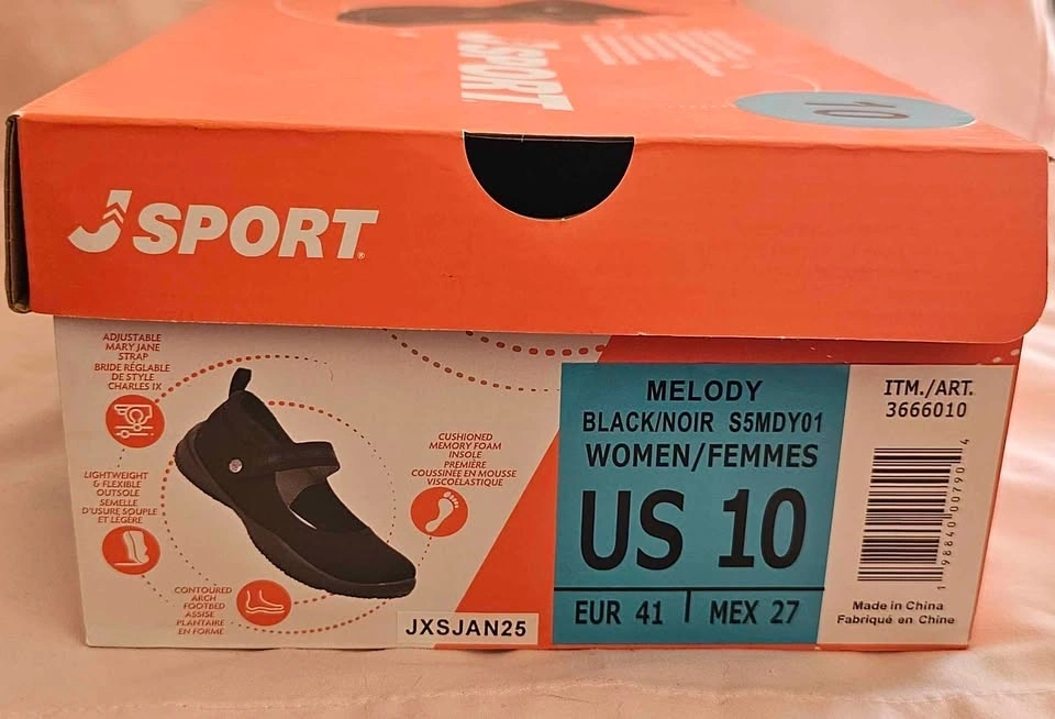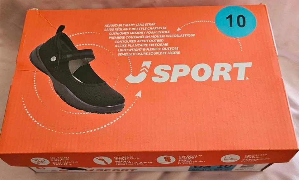 Thank you for considering these comfy black J SPORT Mary Jane flats. Never worn! Brand new in box! These are a Women's size 10M, and have Memory Foam and Arch Footbed for extra comfort. Great for everyday wear. Pick up from a smoke-free home in the McKenzie Lake Douglasdale area in SE Calgary.