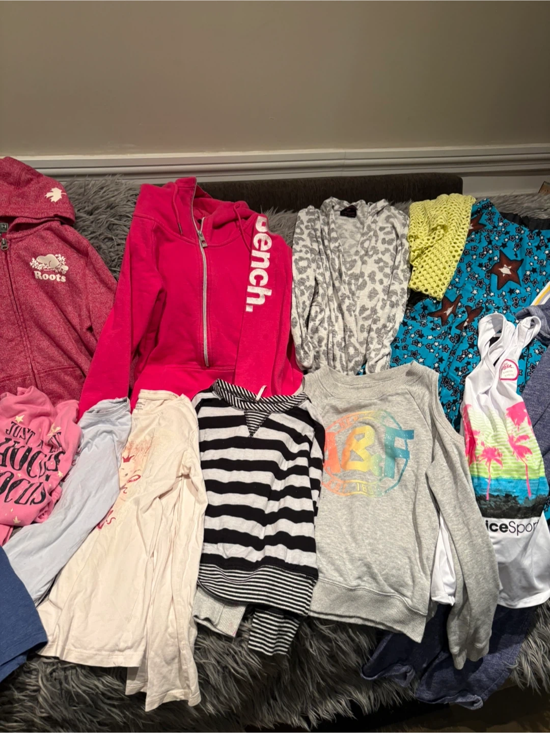 Selling a mixed lot of clothing items! There's a variety of brands including Bench and Roots. Take a look at the photos to see the different styles and colours available. Girls size 10-14