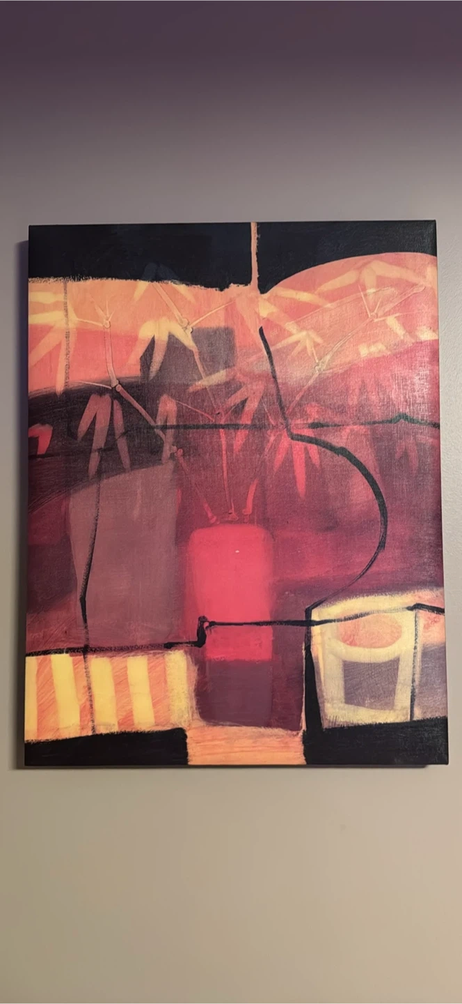 This abstract canvas art features a modern floral design with warm, vibrant colours. It's a lovely piece that adds a pop of colour to any room. Ready to hang, it's perfect for living rooms or hallways!