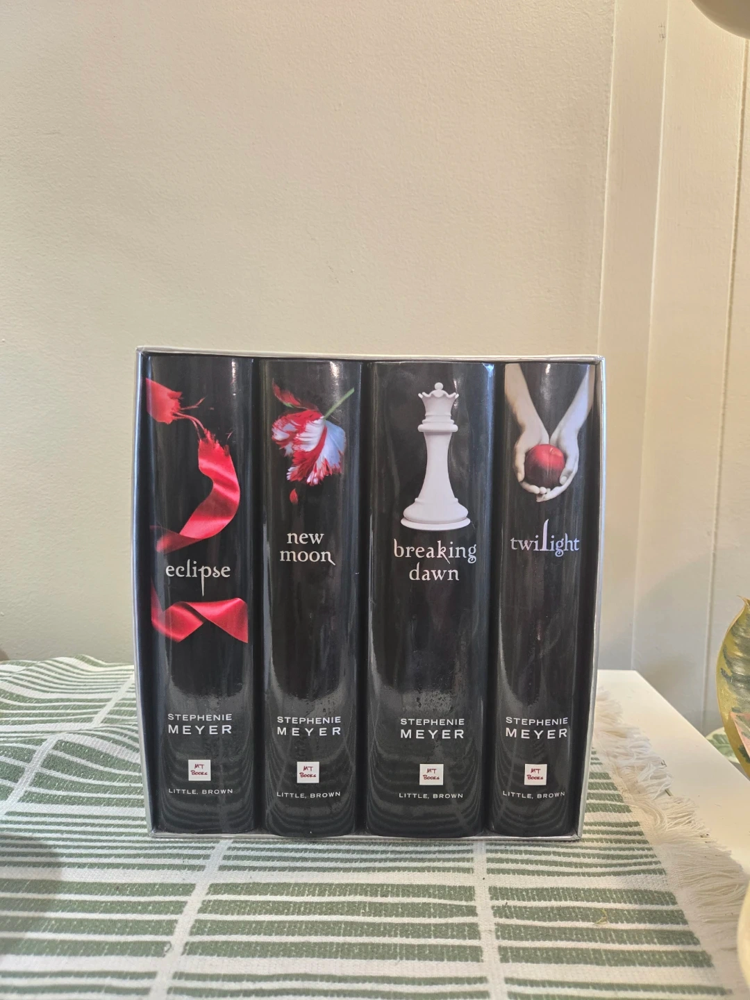 This box set includes the four novels of the Twilight Saga by Stephenie Meyer. The books are Eclipse, New Moon, Breaking Dawn, and Twilight. Published by Little, Brown.