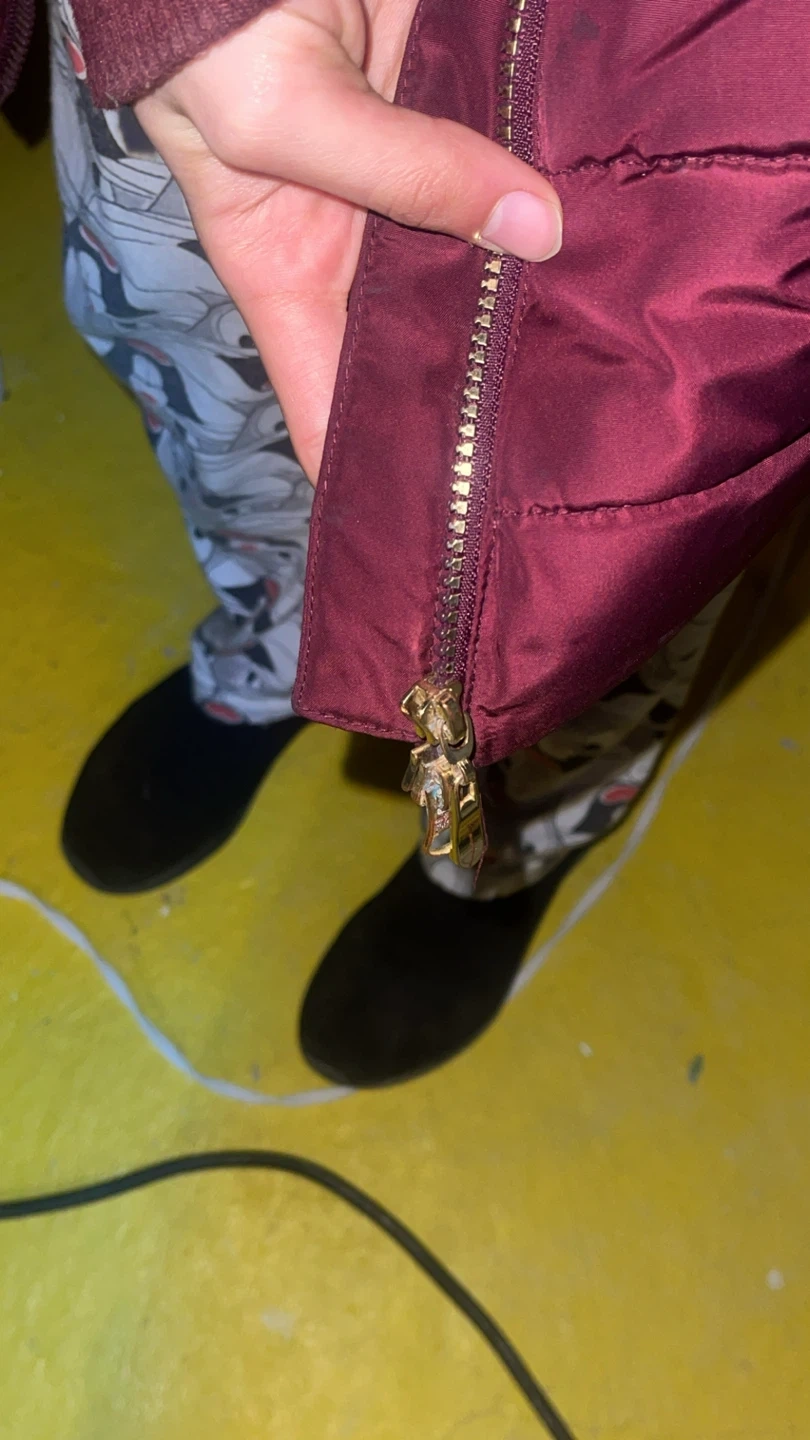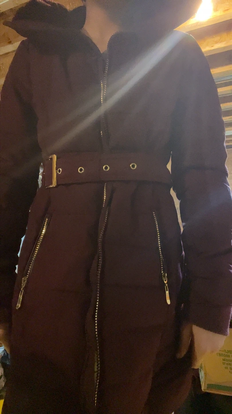 Warm women's puffer coat in a rich burgundy colour. It features a detachable belt with a gold buckle for a cinched waist. The hood is lined with faux fur trim. Zips up the front and has zippered side pockets. It's perfect for staying cozy during colder weather!