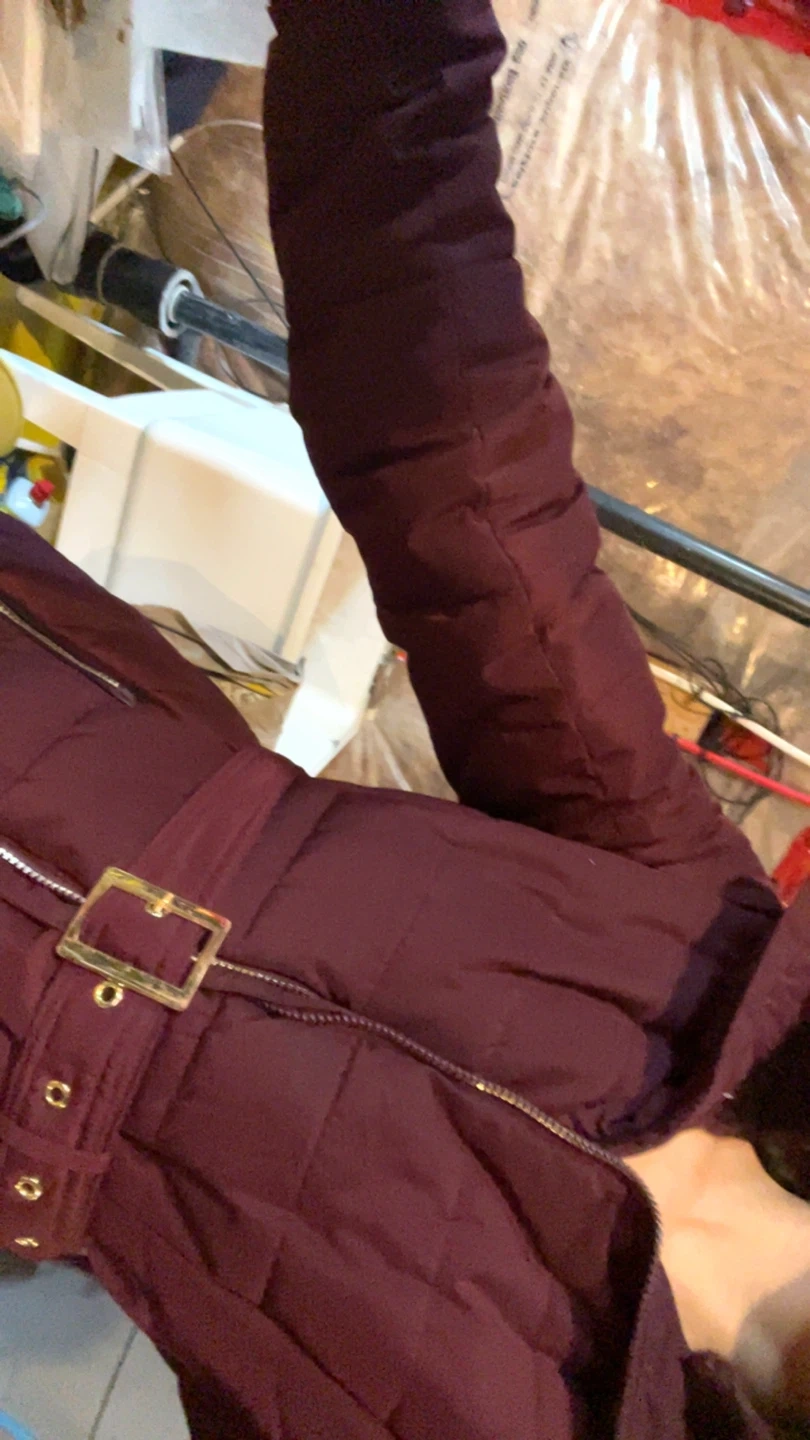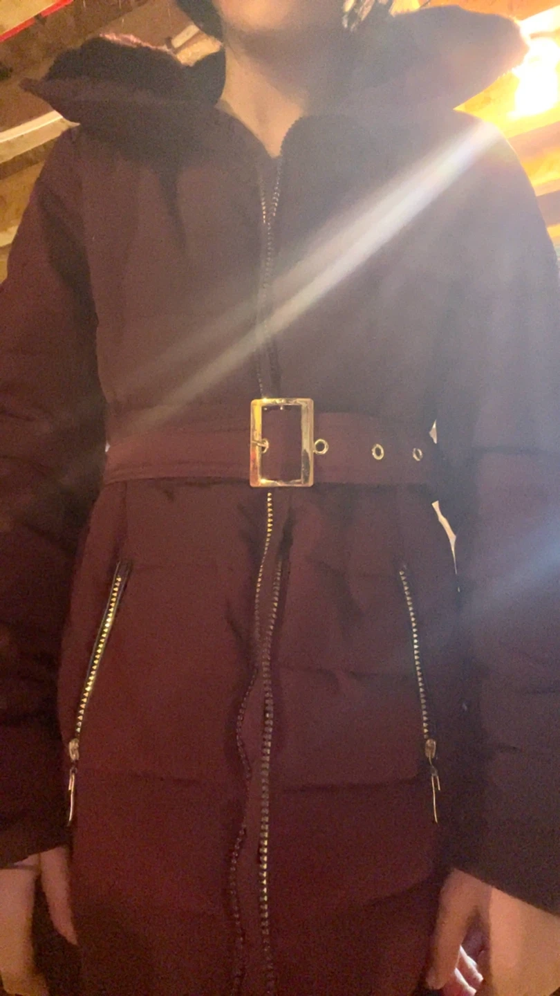 Warm women's puffer coat in a rich burgundy colour. It features a detachable belt with a gold buckle for a cinched waist. The hood is lined with faux fur trim. Zips up the front and has zippered side pockets. It's perfect for staying cozy during colder weather!