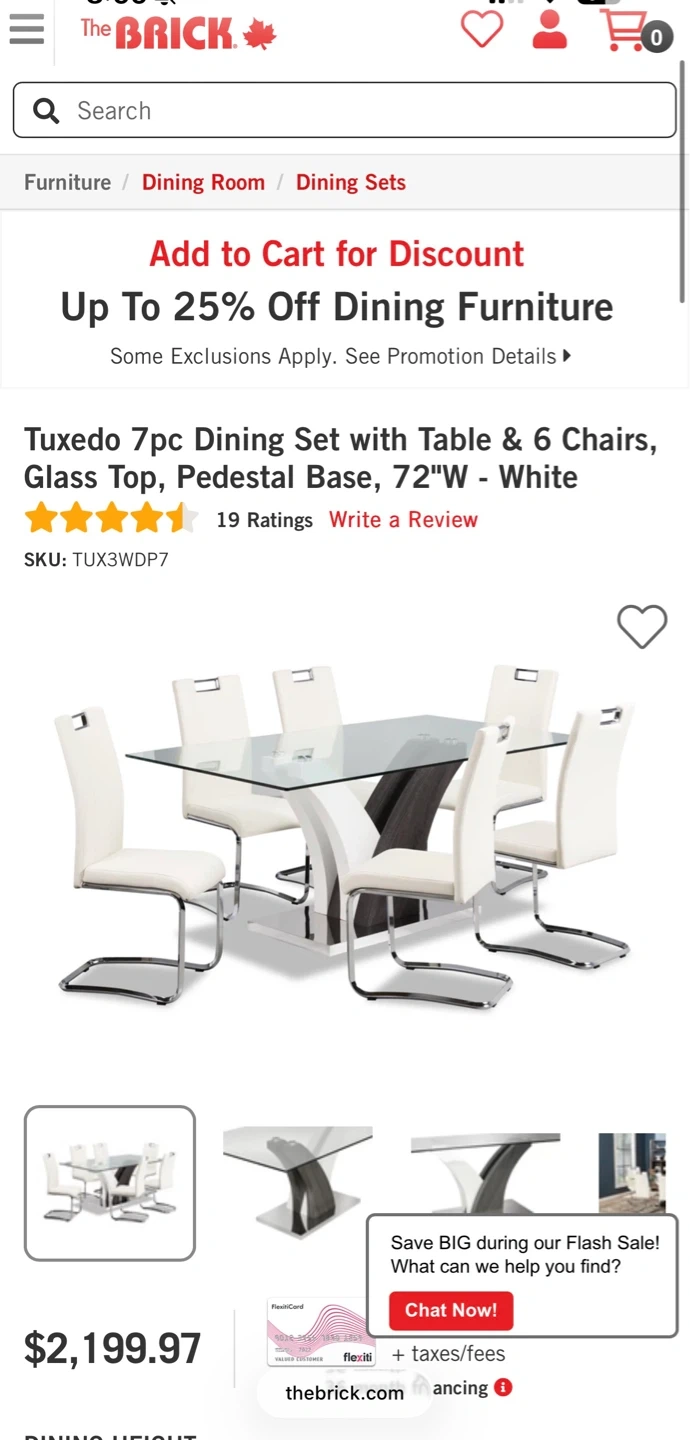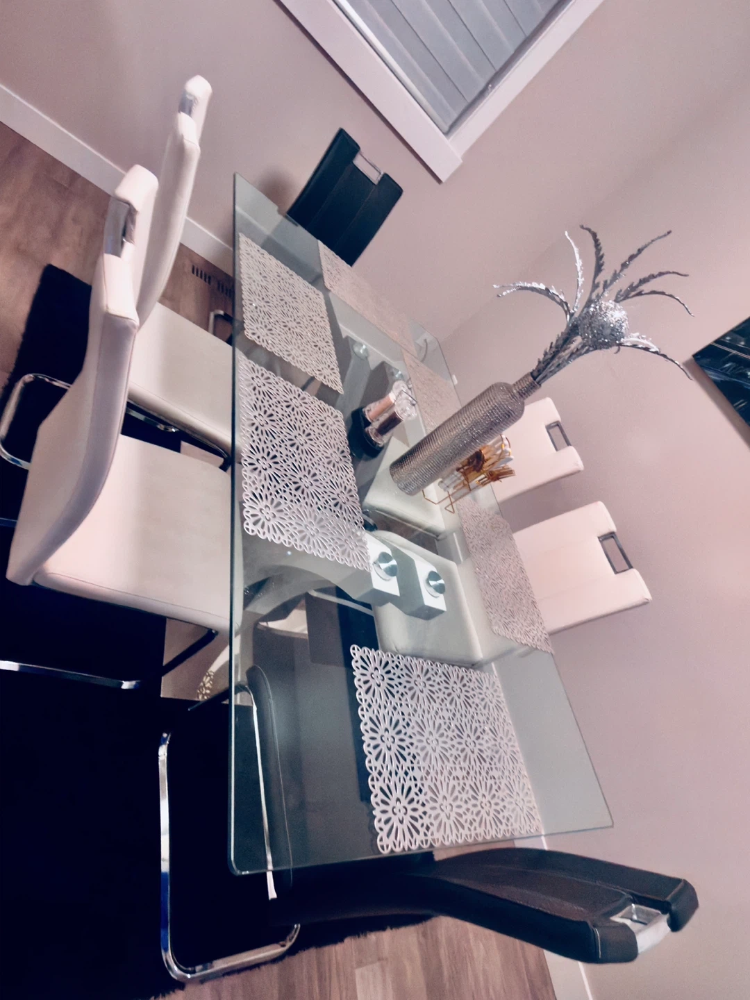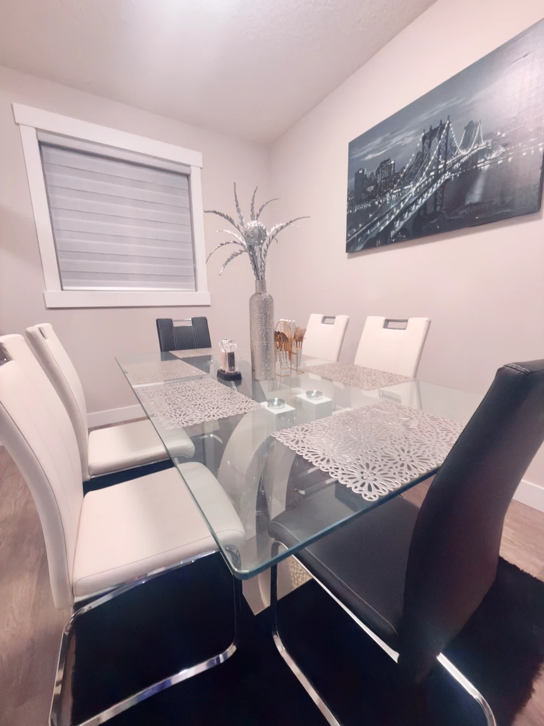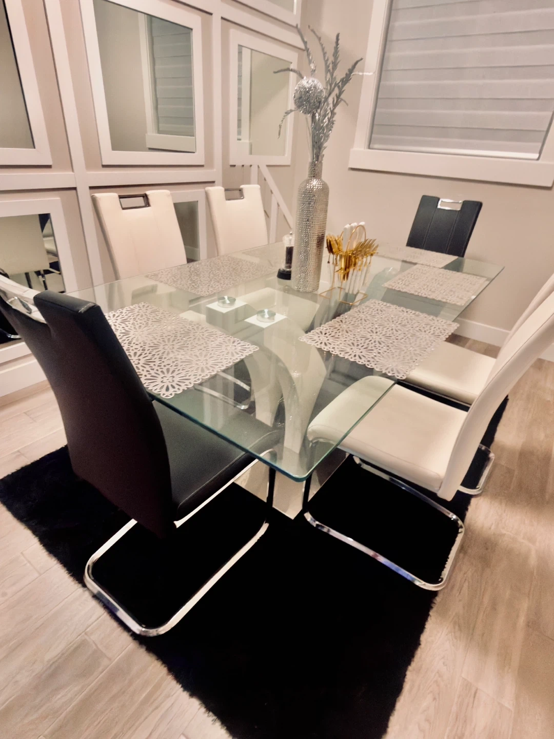 A stylish glass-top dining table with a modern pedestal base. It comes with six chairs, upholstered in black and white faux leather with chrome legs. Perfect for seating family and guests.