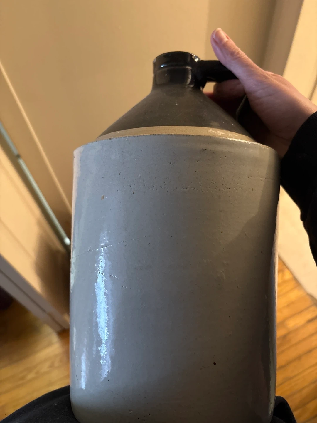 Classic grey stoneware jug with a dark brown top and handle. It's a sturdy, decorative piece that can hold liquids or be used for storage. Perfect for farmhouse decor or country-style kitchens!