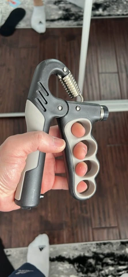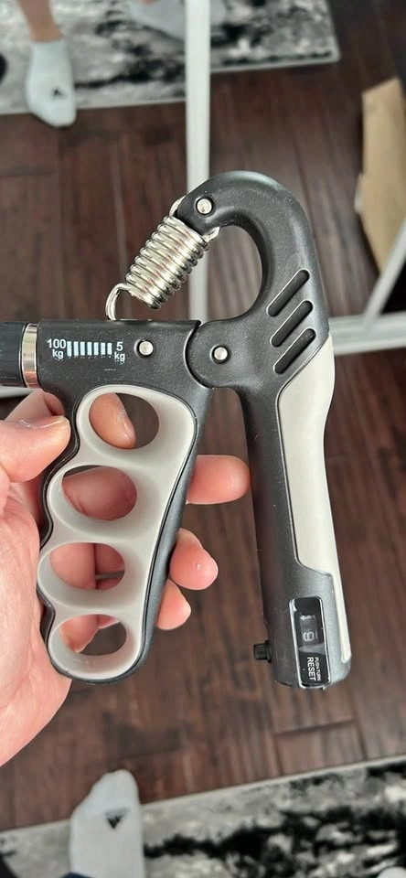 This adjustable hand grip strengthener has a resistance range from 5kg to 100kg. It's made of black and grey plastic with a steel spring. Features a built-in mechanical counter with a reset button and an ergonomic finger-hole grip for stability.