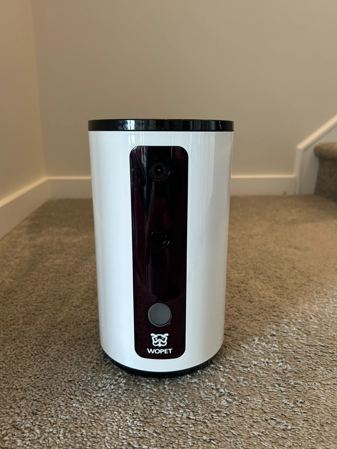 This WOPET pet camera treat dispenser lets you interact with your furry friend remotely. It features a camera and a treat-tossing mechanism. It comes with a power adapter and charging cable.