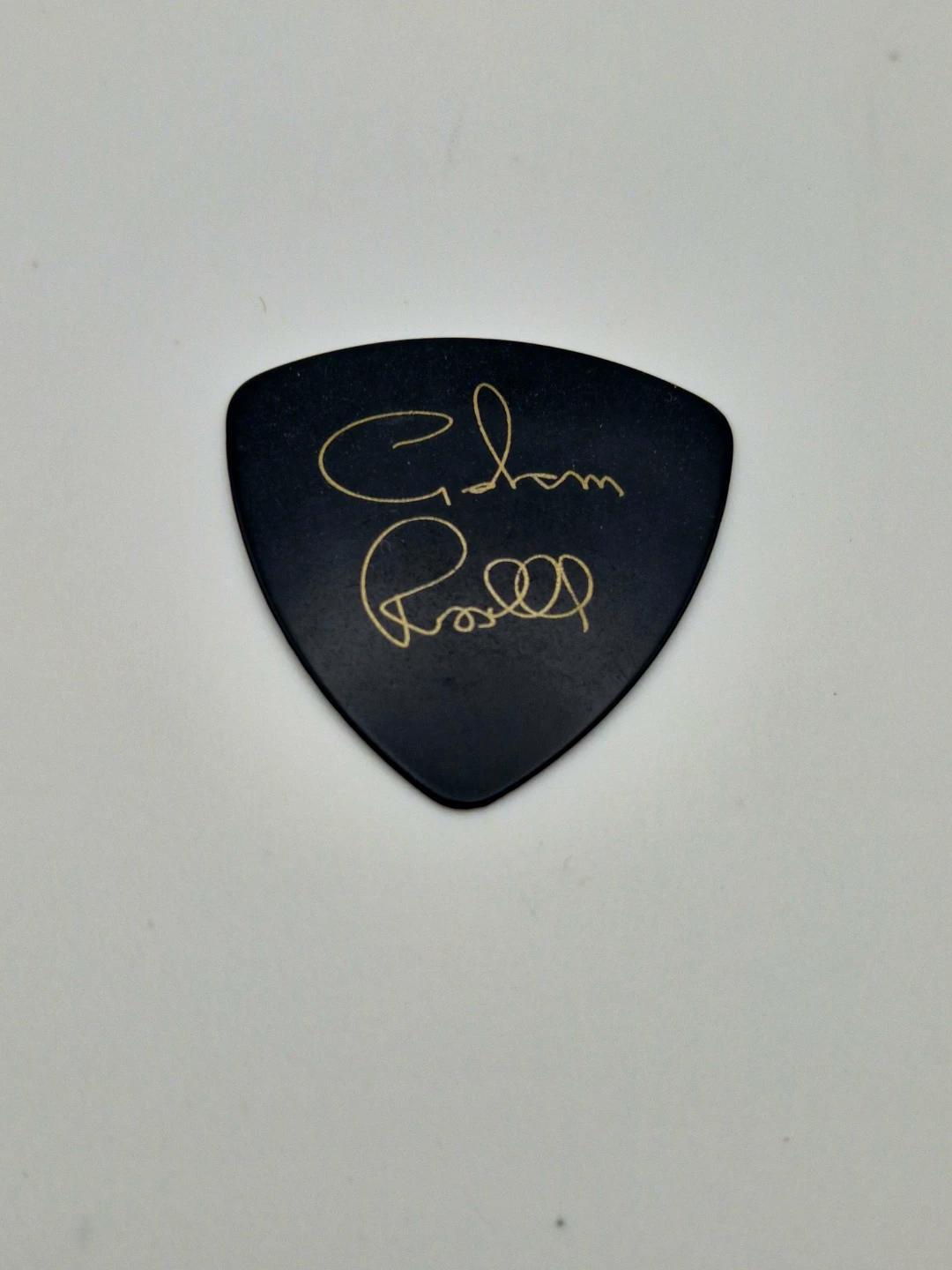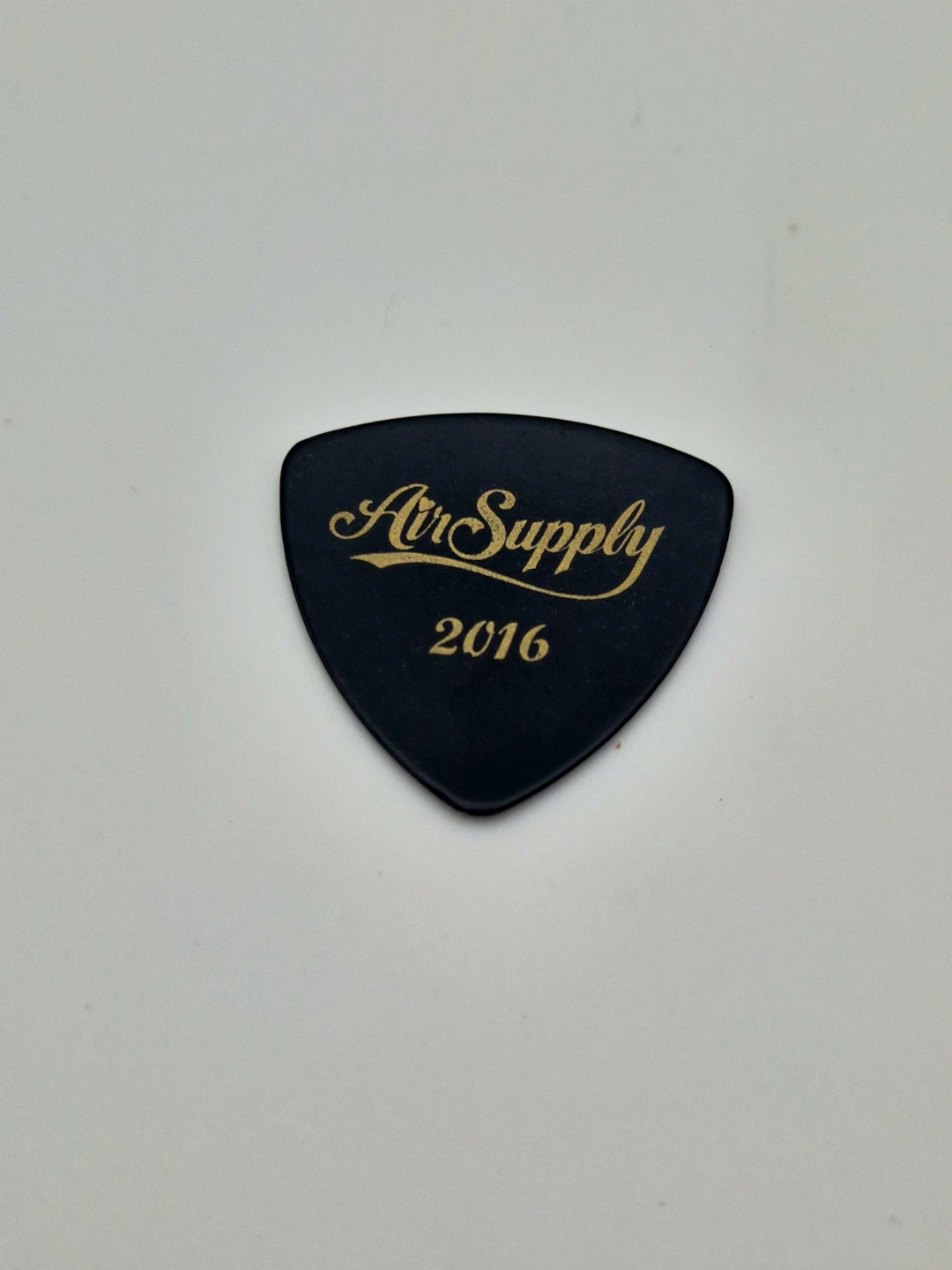 This is a black guitar pick from Air Supply's 2016 tour. It features the band's name and the year printed in gold on one side. The other side has a gold signature that appears to be from Graham Russell. It's a nice collectible for fans!