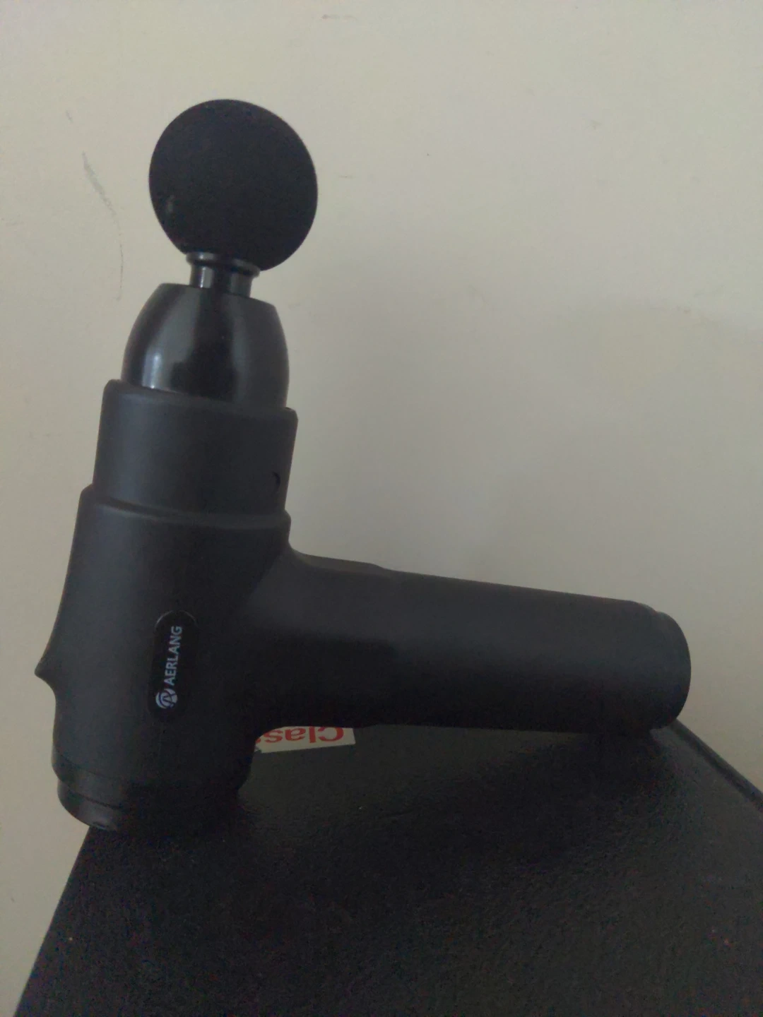 This is an AERLANG massage gun. It's black and includes a round attachment. It's useful for muscle recovery after workouts.