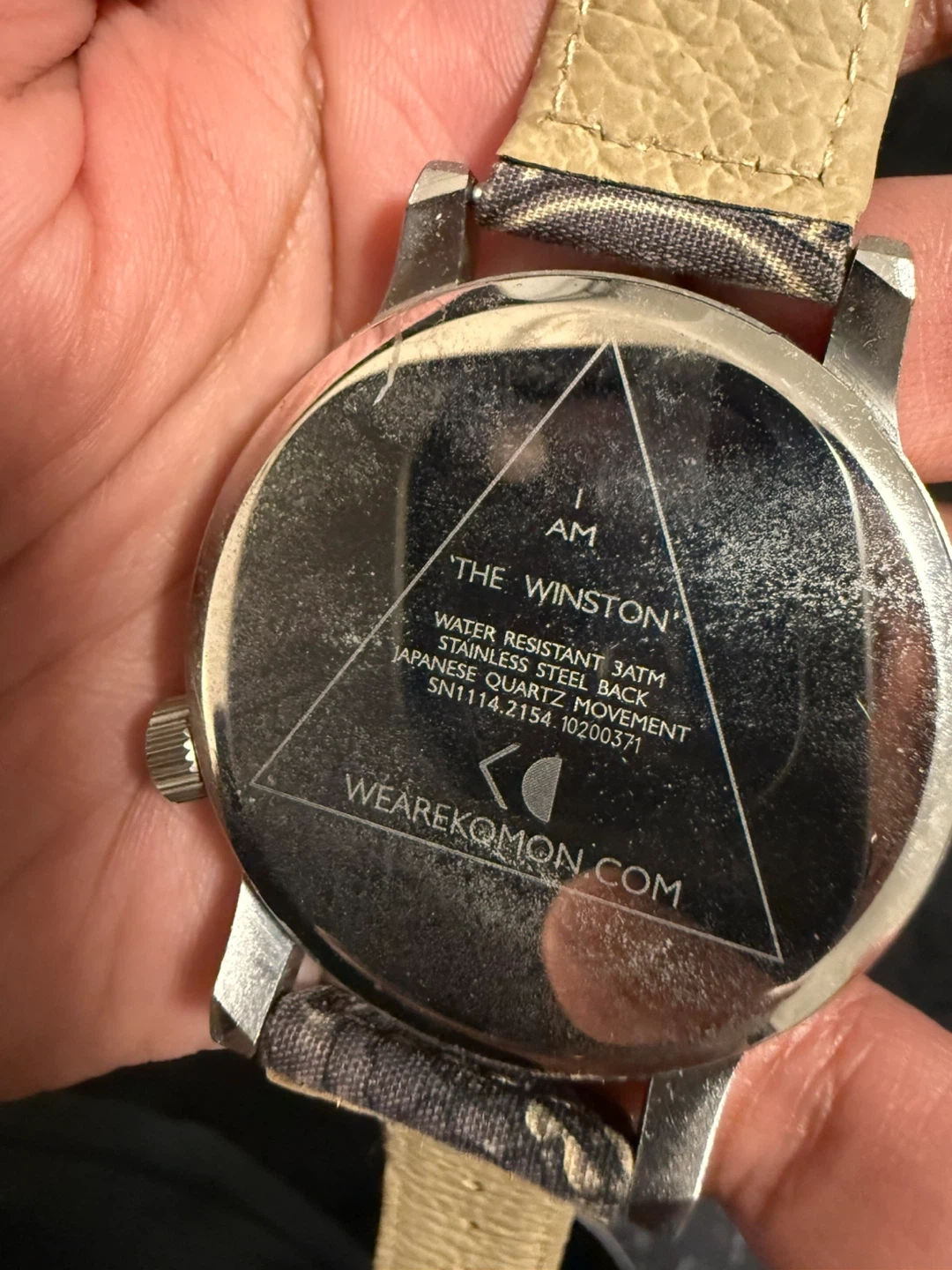 Selling a Komono 'The Winston' watch. It features a water-resistant 3ATM stainless steel back and a Japanese quartz movement. The watch band has a unique paisley pattern. Battery still working.