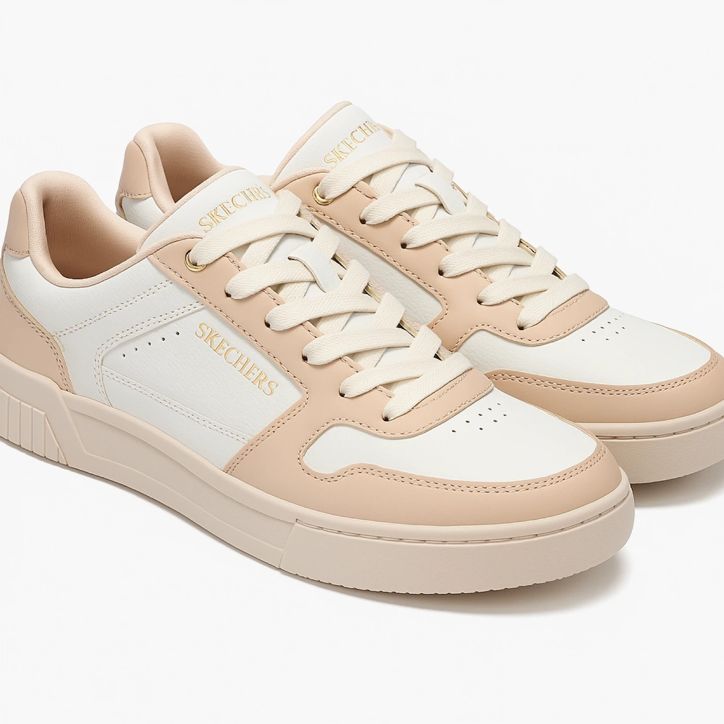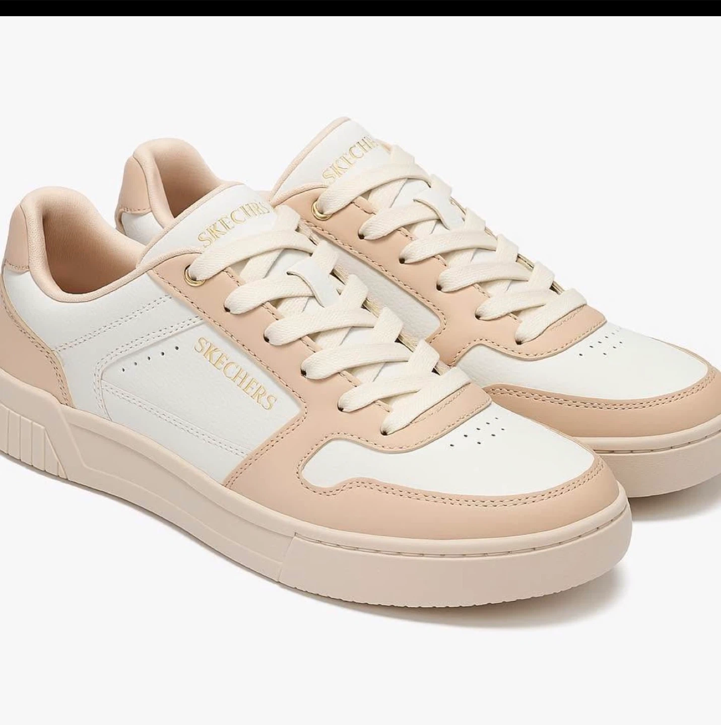 These Skechers sneakers are a stylish off-white and beige colour. They feature a classic lace-up design with gold Skechers branding. Great for casual wear!