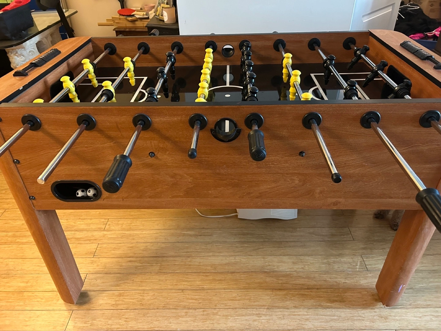 Foosball table, good condition. Solid wood construction. Black and yellow players. Ready for game night! 3 balls included. Can come apart for transporting with a drill and Allen key ( key inc)