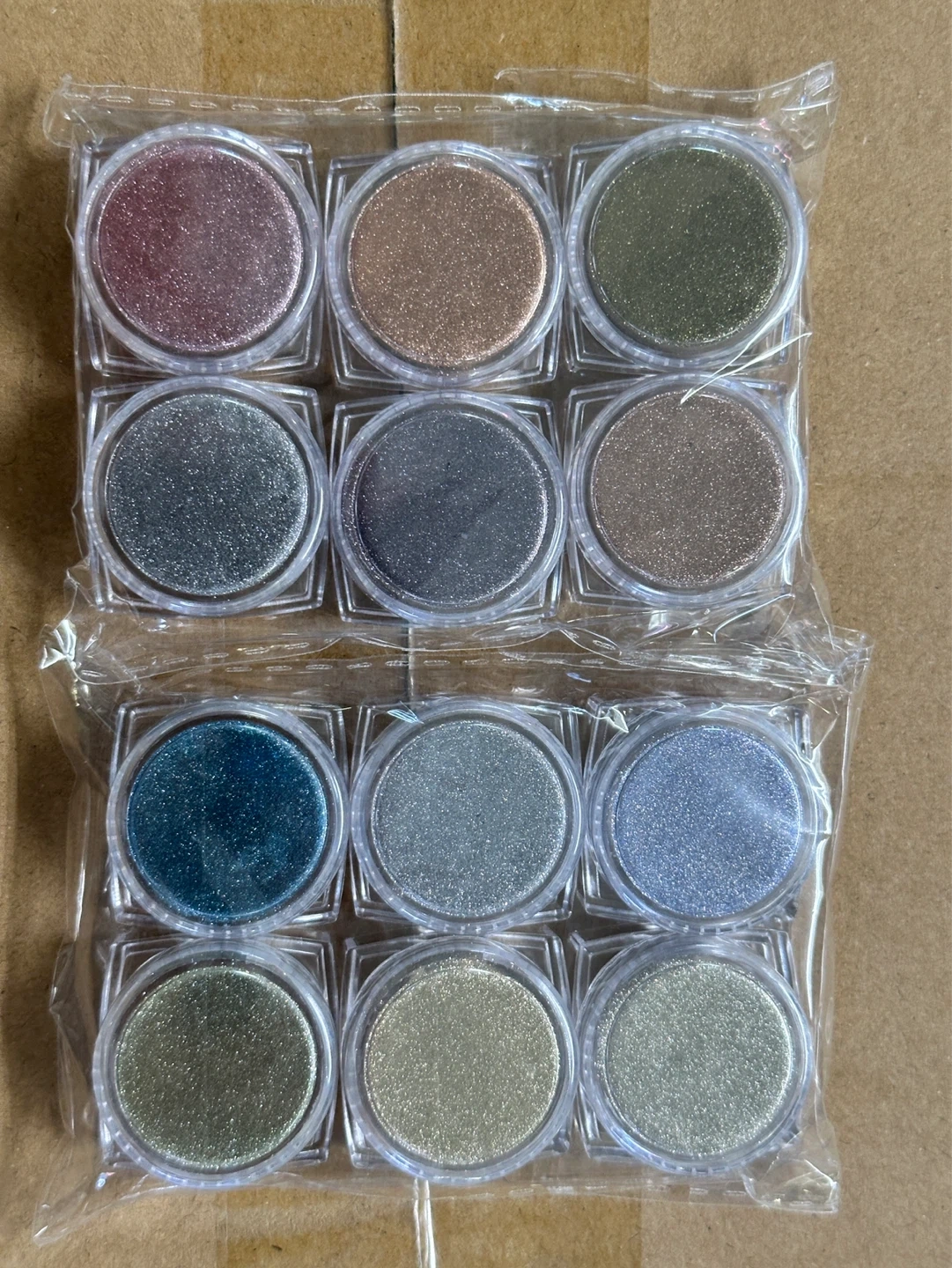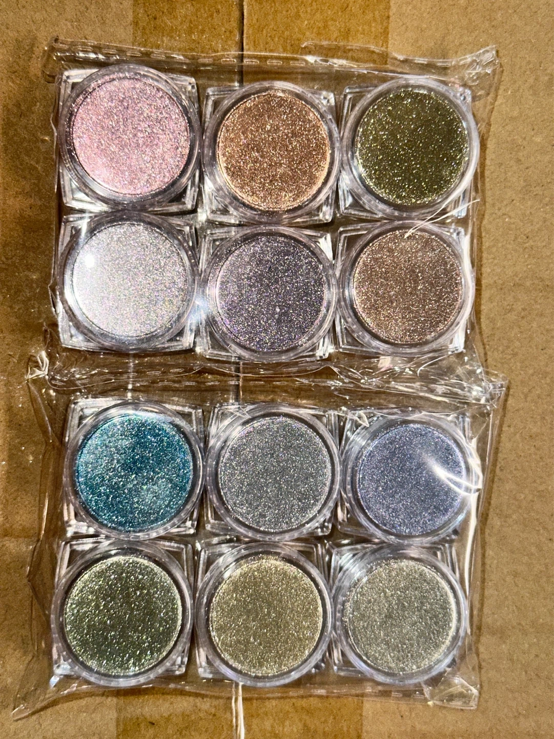 Set of 12 chrome powders. These powders create a mirror like/reflective effect. They can be used in a variety of applications, including nail art, resin art, and makeup.