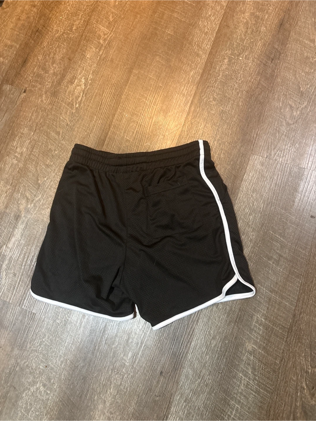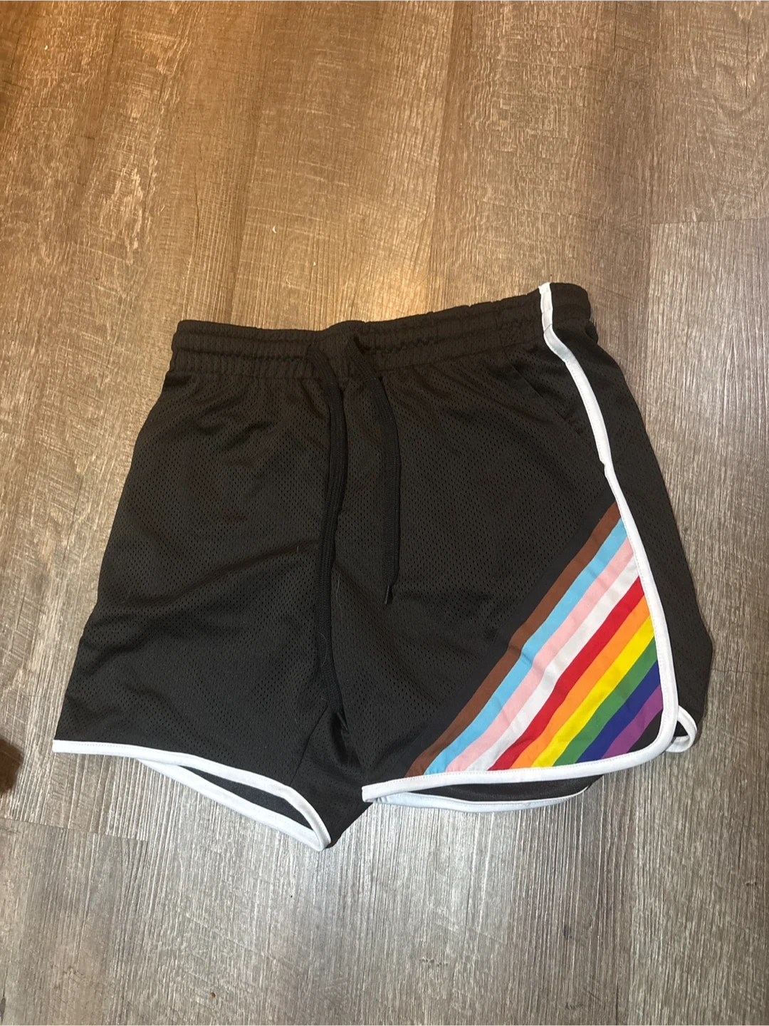 These black athletic shorts are designed for comfort and movement. They feature a mesh fabric and white piping detail. A colourful Pride flag is incorporated on the side. These shorts are great for workouts or casual wear!