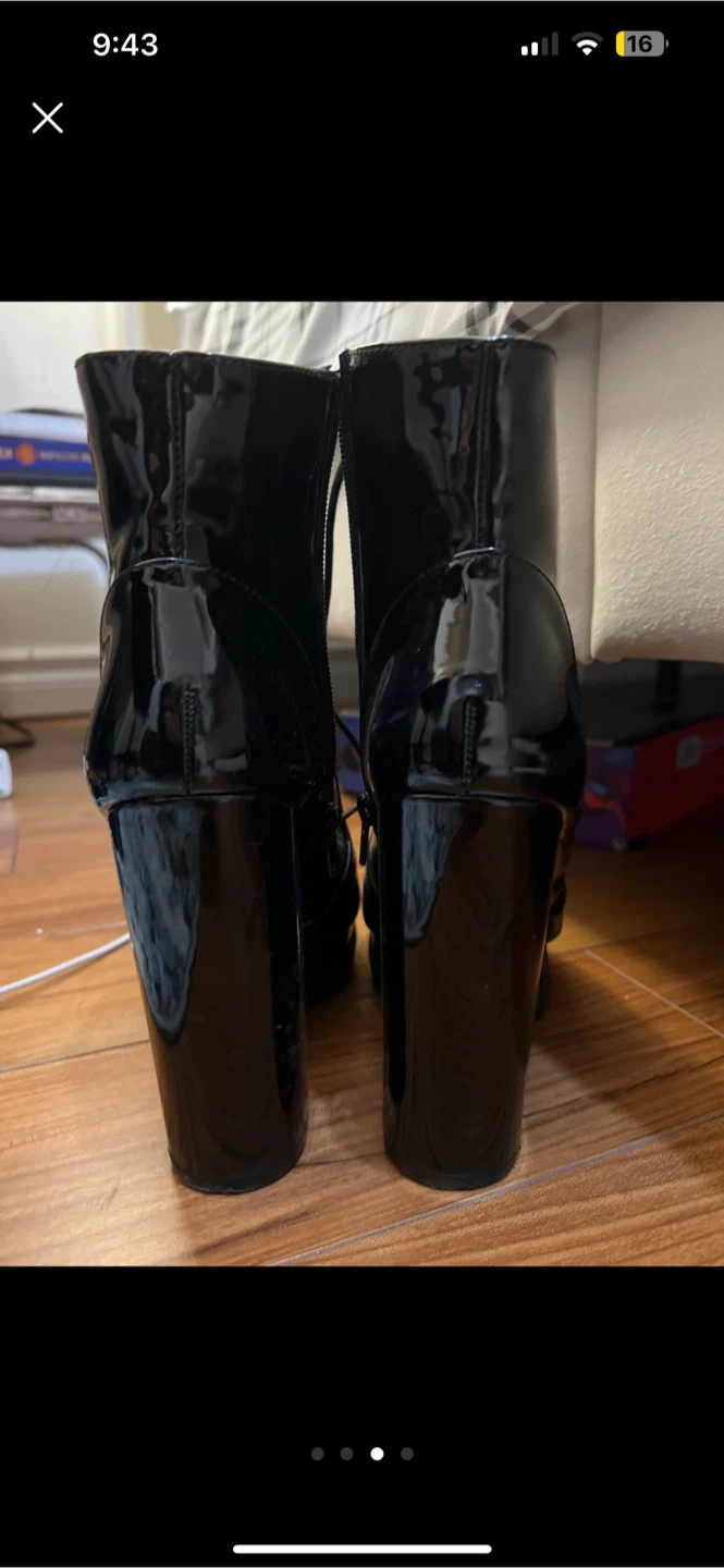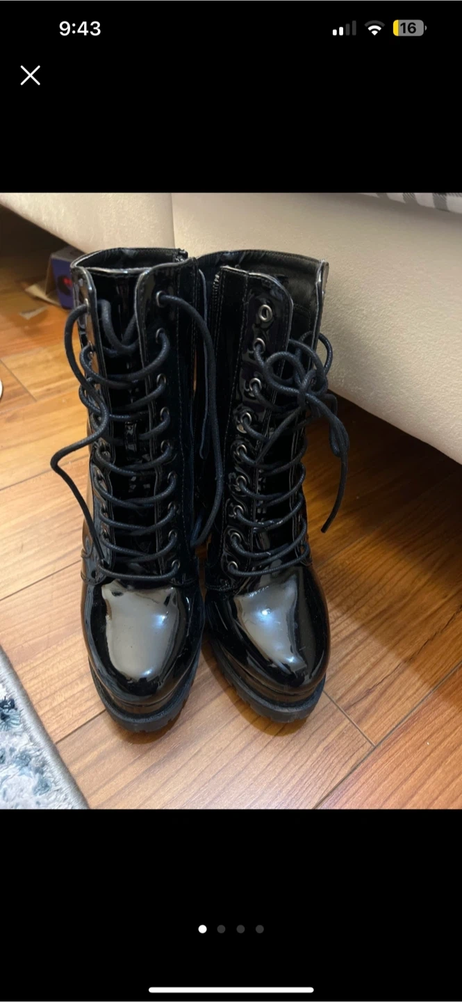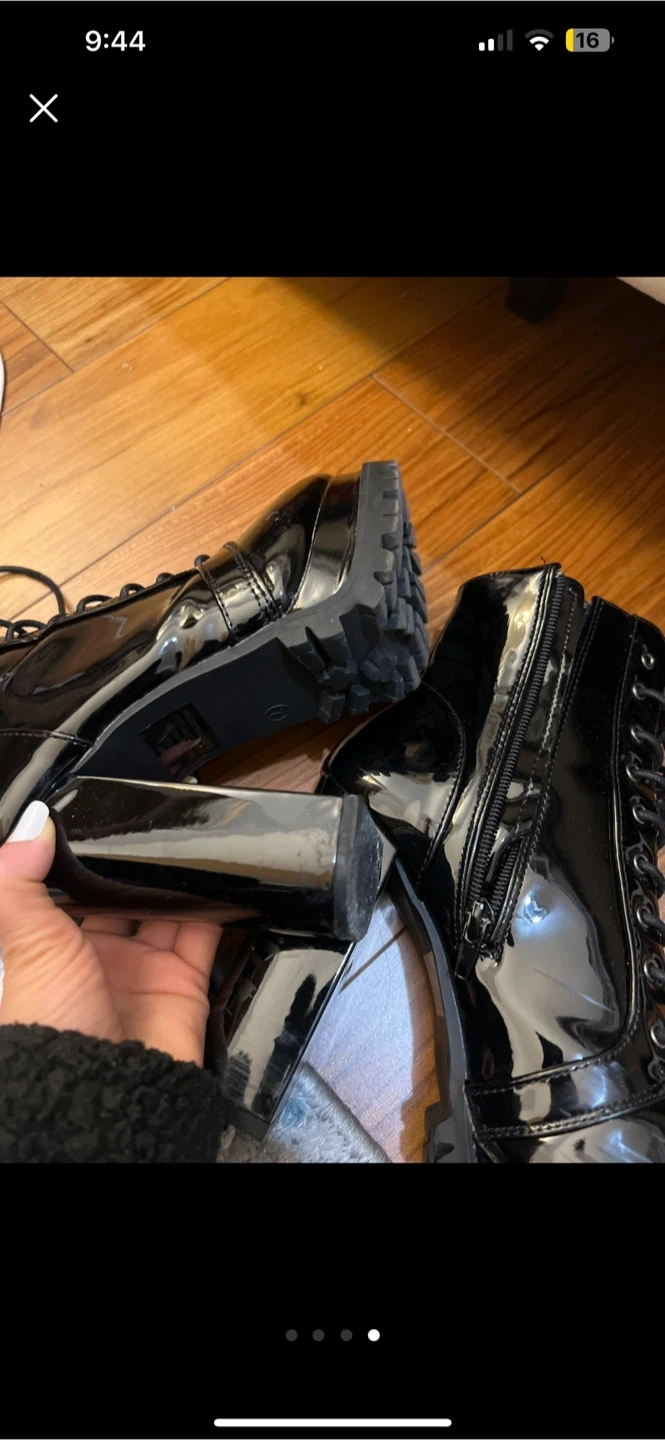 Chunky heel lace-up boots with a patent finish. Features side zipper for easy on and off. Platform sole for added height. Man-made material.
