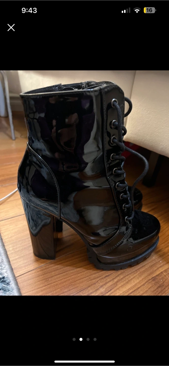 Chunky heel lace-up boots with a patent finish. Features side zipper for easy on and off. Platform sole for added height. Man-made material.
