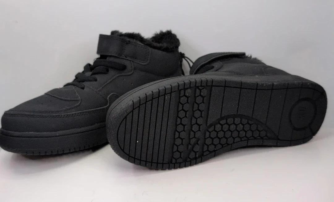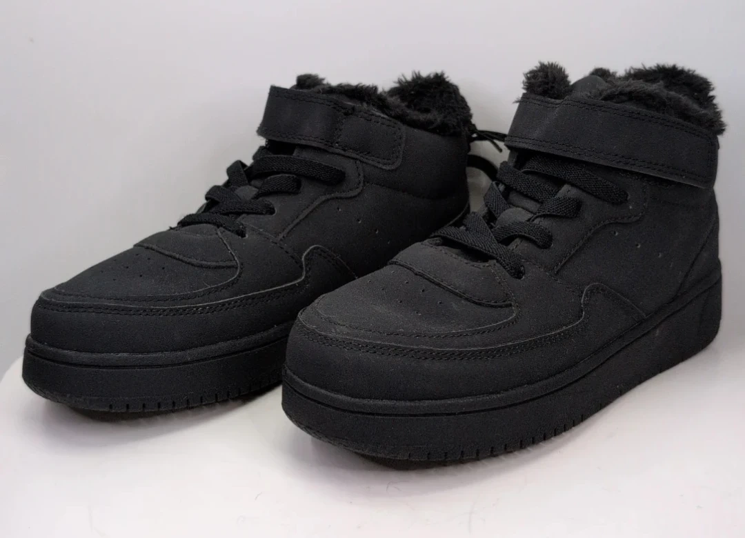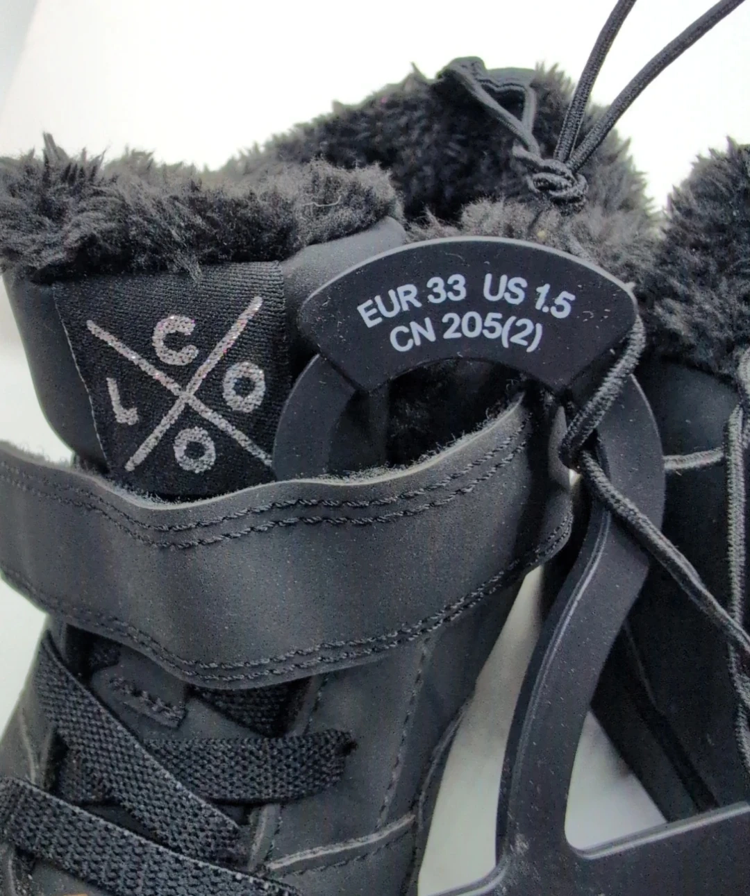 Black winter boots with fur lining. Features a hook-and-loop strap and lace-up closure. EUR 33 size.