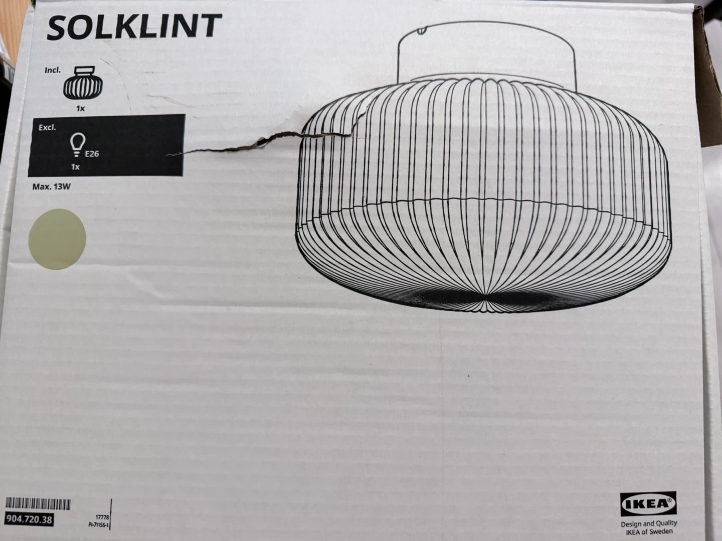 This is the IKEA SOLKLINT pendant lamp. It's designed for an E26 bulb, with a maximum of 13W. The ribbed glass shade provides a decorative light effect. It includes the mounting hardware.