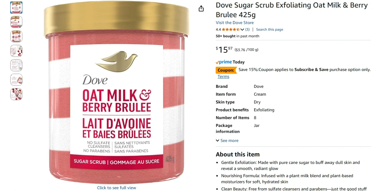 Dove Sugar Scrub Exfoliating Oat Milk & Berry Brulee BNIB