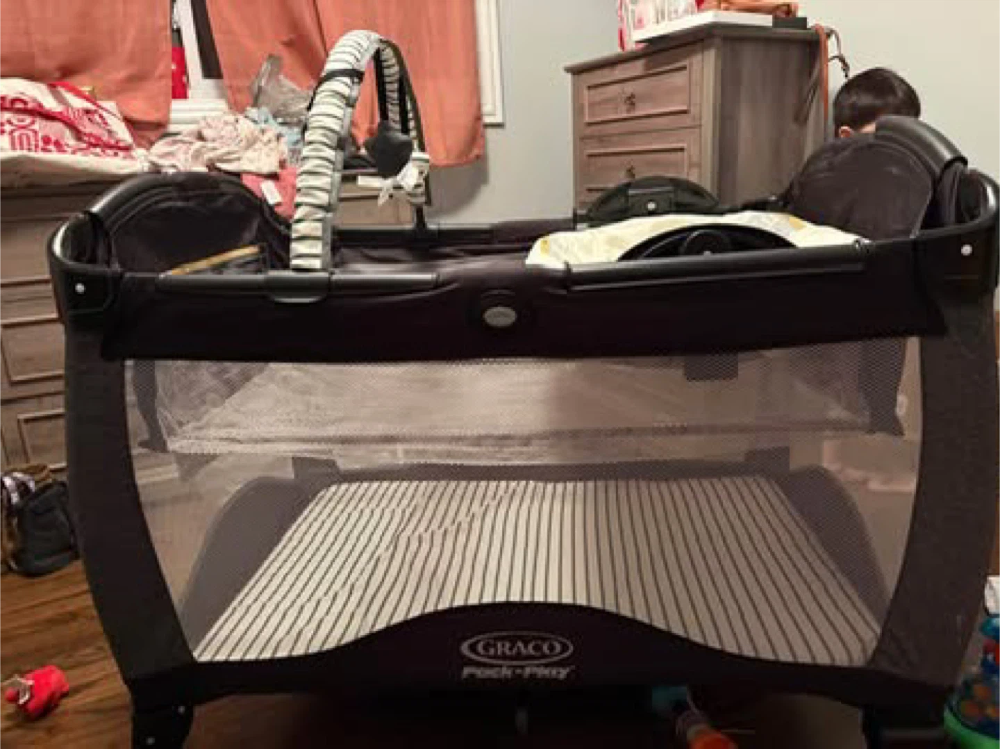 This Graco Pack 'n Play includes a bassinet attachment and a travel bag. It's easy to set up and take down. The side pockets offer convenient storage. It's great for travel or for use at home!