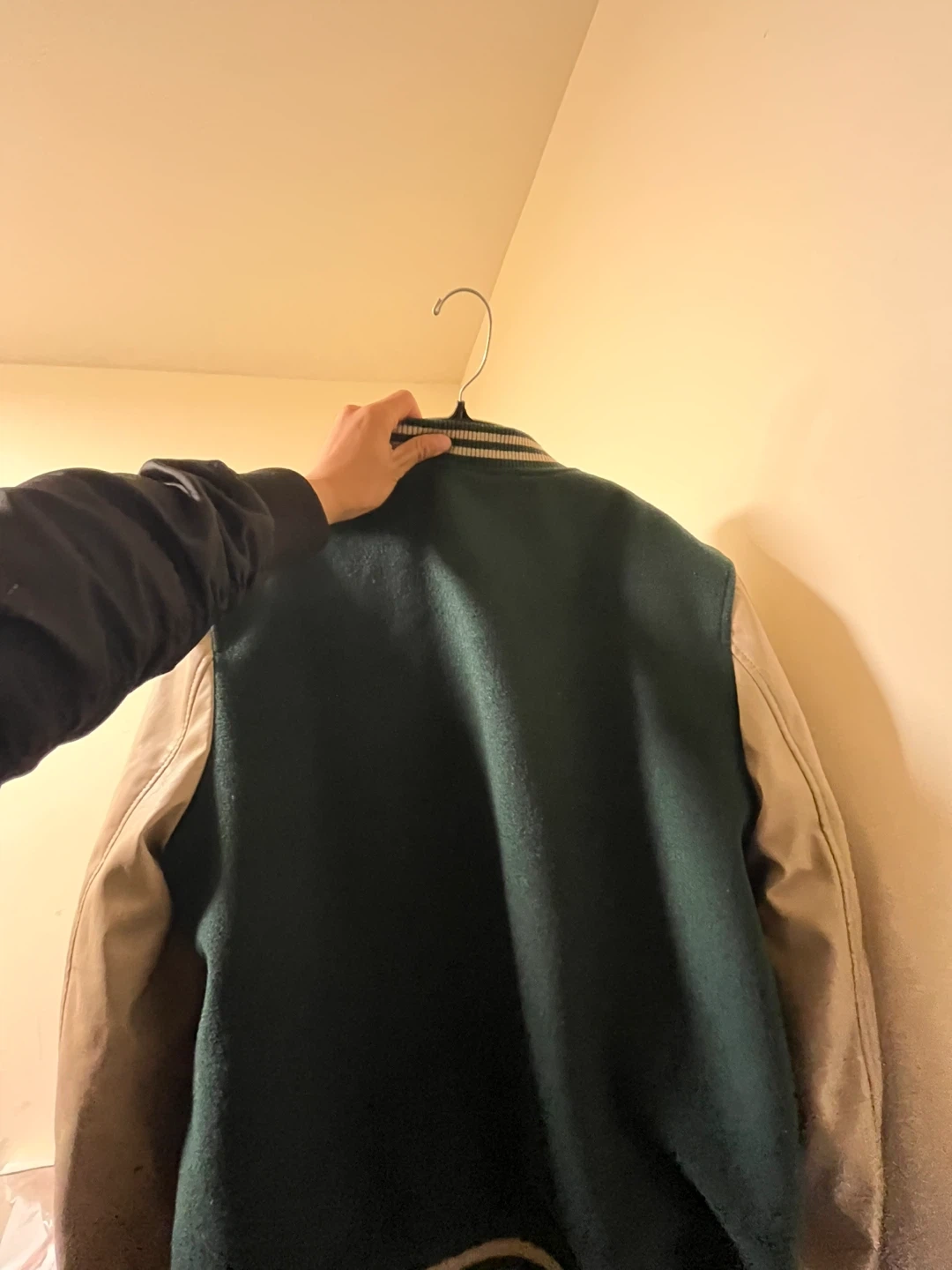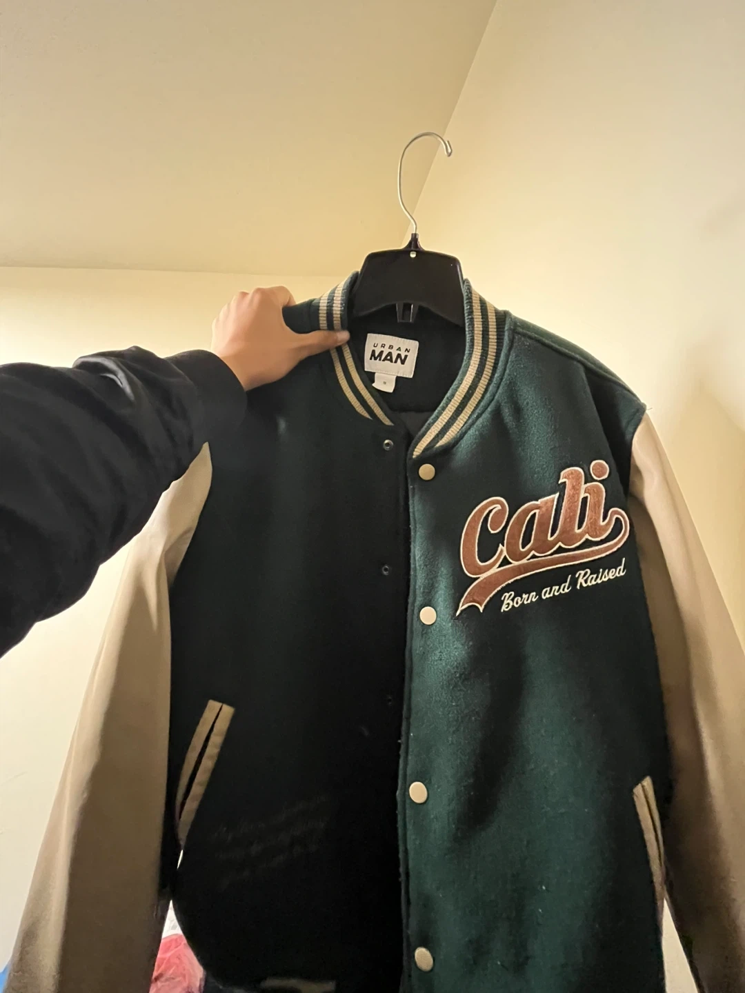 Selling an Urban Man varsity jacket in size medium. It's a cool green colour with cream-coloured sleeves and detailing. The jacket has 'Cali Born & Raised' embroidered on the front. It’s in great condition. Pickup only.